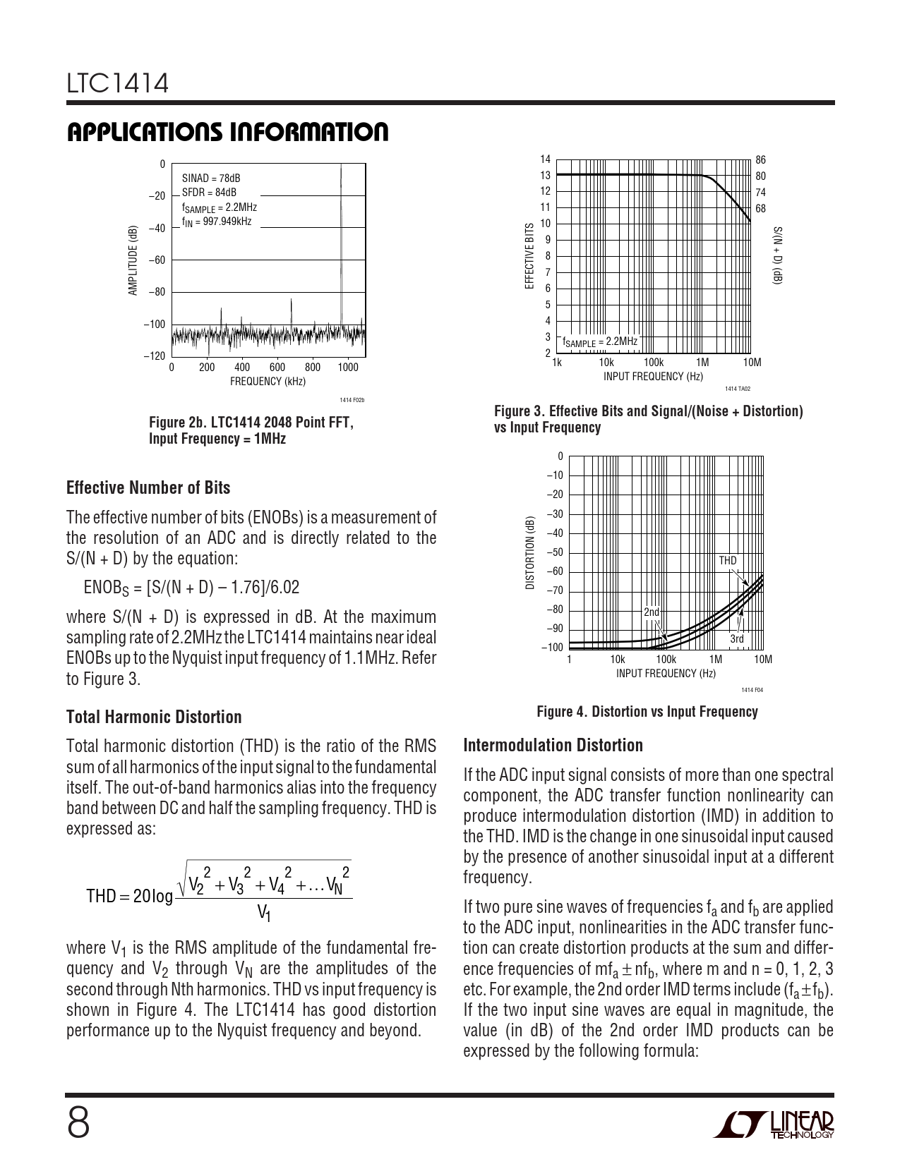 LTC1414 UUWUAPPLICATIONS INFORMATION 14 0 86 SINAD = 78dB 13 80 12 –20 SFDR = 84dB 74 fSAMPLE = 2.2MHz 11 68 f 10 S/(N + D) (dB) –40 IN = 997.949kHz 9 –60 8 7 EFFECTIVE BITS AMPLITUDE (dB) –80 6 5 –100 4 3 fSAMPLE = 2.2MHz –120 2 0 200 400 600 800 1000 1k 10k 100k 1M 10M FREQUENCY (kHz) INPUT FREQUENCY (Hz) 1414 TA02 1414 F02b Figure 3. Effective Bits and Signal/(Noise + Distortion)Figure 2b. LTC1414 2048 Point FFT,vs Input FrequencyInput Frequency = 1MHz 0 –10 Effective Number of Bits –20 The effective number of bits (ENOBs) is a measurement of –30 the resolution of an ADC and is directly related to the –40 S/(N + D) by the equation: –50 THD –60 ENOBS = [S/(N + D) – 1.76]/6.02 DISTORTION (dB) –70 where S/(N + D) is expressed in dB. At the maximum –80 2nd –90 sampling rate of 2.2MHz the LTC1414 maintains near ideal 3rd –100 ENOBs up to the Nyquist input frequency of 1.1MHz. Refer 1 10k 100k 1M 10M to Figure␣ 3. INPUT FREQUENCY (Hz) 1414 F04 Figure 4. Distortion vs Input FrequencyTotal Harmonic Distortion Total harmonic distortion (THD) is the ratio of the RMS Intermodulation Distortion sum of all harmonics of the input signal to the fundamental If the ADC input signal consists of more than one spectral itself. The out-of-band harmonics alias into the frequency component, the ADC transfer function nonlinearity can band between DC and half the sampling frequency. THD is produce intermodulation distortion (IMD) in addition to expressed as: the THD. IMD is the change in one sinusoidal input caused by the presence of another sinusoidal input at a different 2 2 2 2 frequency. V + V3 + V4 +…V THD N = 20 2 log If two pure sine waves of frequencies f V a and fb are applied 1 to the ADC input, nonlinearities in the ADC transfer func- where V tion can create distortion products at the sum and differ- 1 is the RMS amplitude of the fundamental fre- quency and V ence frequencies of mf 2 through VN are the amplitudes of the a ± nfb, where m and n = 0, 1, 2, 3 second through Nth harmonics. THD vs input frequency is etc. For example, the 2nd order IMD terms include (fa ± fb). shown in Figure 4. The LTC1414 has good distortion If the two input sine waves are equal in magnitude, the performance up to the Nyquist frequency and beyond. value (in dB) of the 2nd order IMD products can be expressed by the following formula: 8