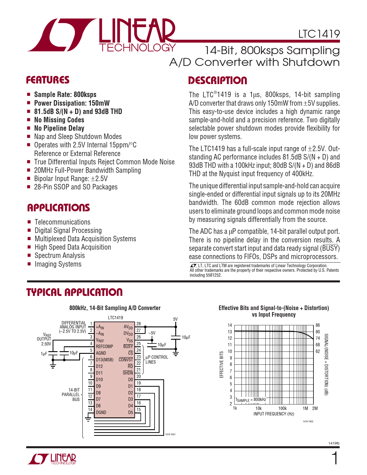 LTC1419 14-Bit, 800ksps Sampling A/D Converter with Shutdown UFEATURESDESCRIPTIO ■ Sample Rate: 800ksps The LTC®1419 is a 1µs, 800ksps, 14-bit sampling ■ Power Dissipation: 150mW A/D converter that draws only 150mW from ±5V supplies. ■ 81.5dB S/(N + D) and 93dB THD This easy-to-use device includes a high dynamic range ■ No Missing Codes sample-and-hold and a precision reference. Two digitally ■ No Pipeline Delay selectable power shutdown modes provide flexibility for ■ Nap and Sleep Shutdown Modes low power systems. ■ Operates with 2.5V Internal 15ppm/°C The LTC1419 has a full-scale input range of ±2.5V. Out- Reference or External Reference standing AC performance includes 81.5dB S/(N + D) and ■ True Differential Inputs Reject Common Mode Noise 93dB THD with a 100kHz input; 80dB S/(N + D) and 86dB ■ 20MHz Full-Power Bandwidth Sampling THD at the Nyquist input frequency of 400kHz. ■ Bipolar Input Range: ±2.5V ■ 28-Pin SSOP and SO Packages The unique differential input sample-and-hold can acquire single-ended or differential input signals up to its 20MHz U bandwidth. The 60dB common mode rejection allows APPLICATIO S users to eliminate ground loops and common mode noise by measuring signals differentially from the source. ■ Telecommunications ■ Digital Signal Processing The ADC has a µP compatible, 14-bit parallel output port. ■ Multiplexed Data Acquisition Systems There is no pipeline delay in the conversion results. A ■ High Speed Data Acquisition separate convert start input and data ready signal (BUSY) ■ Spectrum Analysis ease connections to FIFOs, DSPs and microprocessors. ■ Imaging Systems , LT, LTC and LTM are registered trademarks of Linear Technology Corporation. All other trademarks are the property of their respective owners. Protected by U.S. Patents including 5581252. UTYPICAL APPLICATIO800kHz, 14-Bit Sampling A/D ConverterEffective Bits and Signal-to-(Noise + Distortion)vs Input Frequency LTC1419 5V DIFFERENTIAL 1 28 ANALOG INPUT +A 14 86 IN AVDD 2 27 (–2.5V TO 2.5V) –A 13 80 SIGNAL/(NOISE + DISTORTION) (dB) V IN DVDD –5V REF 3 26 OUTPUT 10µF V 12 74 REF VSS 2.50V 4 25 REFCOMP BUSY 10µF 11 68 5 24 10 62 1µF 10µF AGND CS 6 23 µP CONTROL D13(MSB) CONVST 9 7 22 LINES D12 RD 8 8 21 D11 SHDN 7 9 20 EFFECTIVE BITS 6 D10 D0 10 19 5 D9 D1 14-BIT 11 18 4 D8 D2 PARALLEL 12 17 3 BUS D7 D3 fSAMPLE = 800kHz 13 16 2 D6 D4 14 15 1k 10k 100k 1M 2M DGND D5 INPUT FREQUENCY (Hz) 1419 TA02 1419 TA01 1419fb 1
