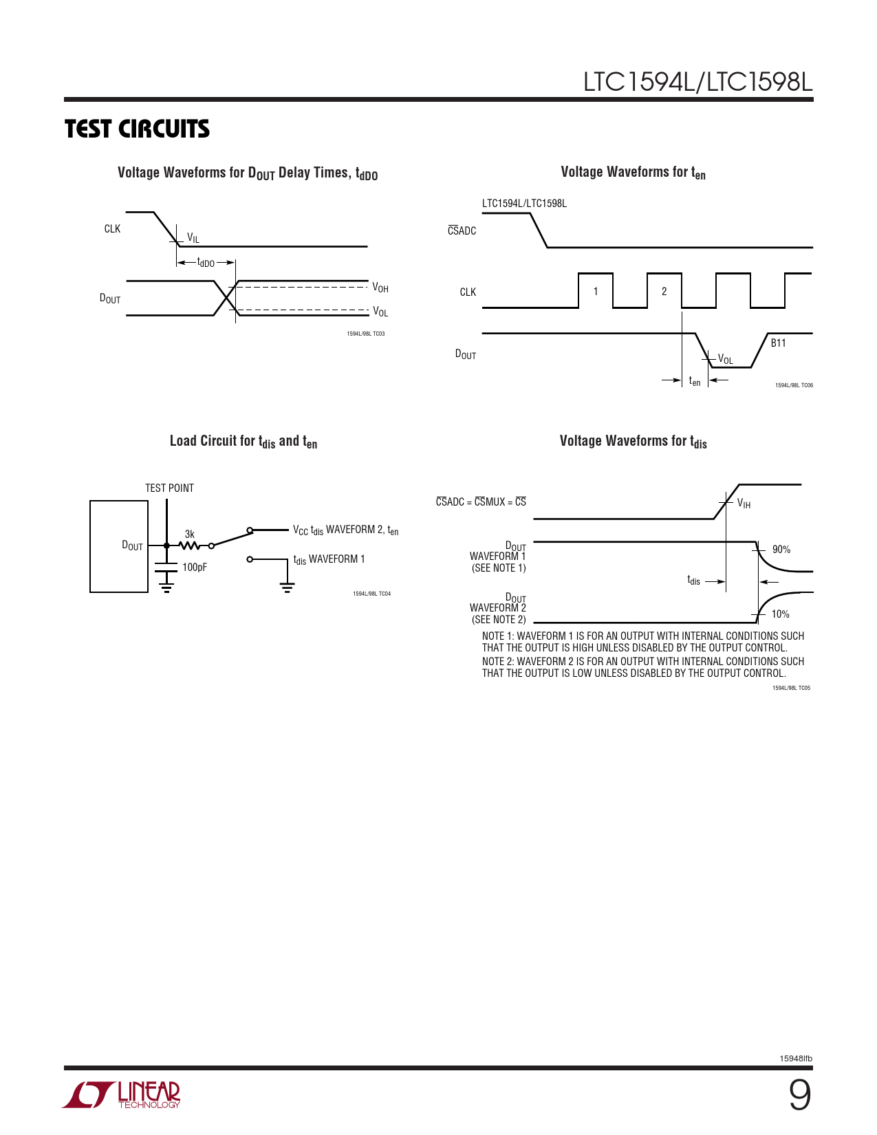 TEST POINT CSADC = CSMUX = CS VIH V 3k CC tdis WAVEFORM 2, ten DOUT DOUT 90% WAVEFORM 1 tdis WAVEFORM 1 100pF (SEE NOTE 1) tdis 1594L/98L TC04 DOUT WAVEFORM 2 10% (SEE NOTE 2) NOTE 1: WAVEFORM 1 IS FOR AN OUTPUT WITH INTERNAL CONDITIONS SUCH THAT THE OUTPUT IS HIGH UNLESS DISABLED BY THE OUTPUT CONTROL. NOTE 2: WAVEFORM 2 IS FOR AN OUTPUT WITH INTERNAL CONDITIONS SUCH THAT THE OUTPUT IS LOW UNLESS DISABLED BY THE OUTPUT CONTROL. 1594L/98L TC05 15948lfb 9