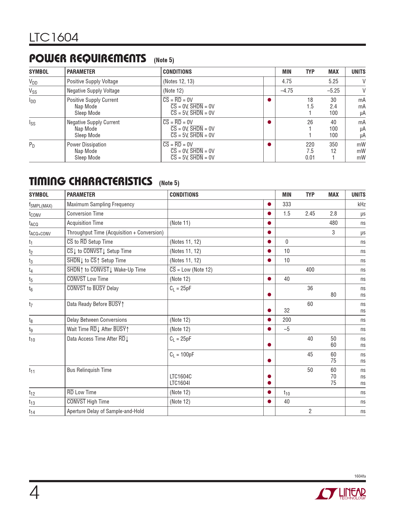 fSMPL(MAX) Maximum Sampling Frequency l 333 kHz tCONV Conversion Time l 1.5 2.45 2.8 μs tACQ Acquisition Time (Note 11) l 480 ns tACQ+CONV Throughput Time (Acquisition + Conversion) l 3 μs t1 CS to RD Setup Time (Notes 11, 12) l 0 ns t2 CS↓ to CONVST↓ Setup Time (Notes 11, 12) l 10 ns t3 SHDN↓ to CS↑ Setup Time (Notes 11, 12) l 10 ns t4 SHDN↑ to CONVST↓ Wake-Up Time CS = Low (Note 12) 400 ns t5 CONVST Low Time (Note 12) l 40 ns t6 CONVST to BUSY Delay CL = 25pF 36 ns l 80 ns t7 Data Ready Before BUSY↑ 60 ns l 32 ns t8 Delay Between Conversions (Note 12) l 200 ns t9 Wait Time RD↓ After BUSY↑ (Note 12) l –5 ns t10 Data Access Time After RD↓ CL = 25pF 40 50 ns l 60 ns CL = 100pF 45 60 ns l 75 ns t11 Bus Relinquish Time 50 60 ns LTC1604C l 70 ns LTC1604I l 75 ns t12 RD Low Time (Note 12) l t10 ns t13 CONVST High Time (Note 12) l 40 ns t14 Aperture Delay of Sample-and-Hold 2 ns 1604fa 4