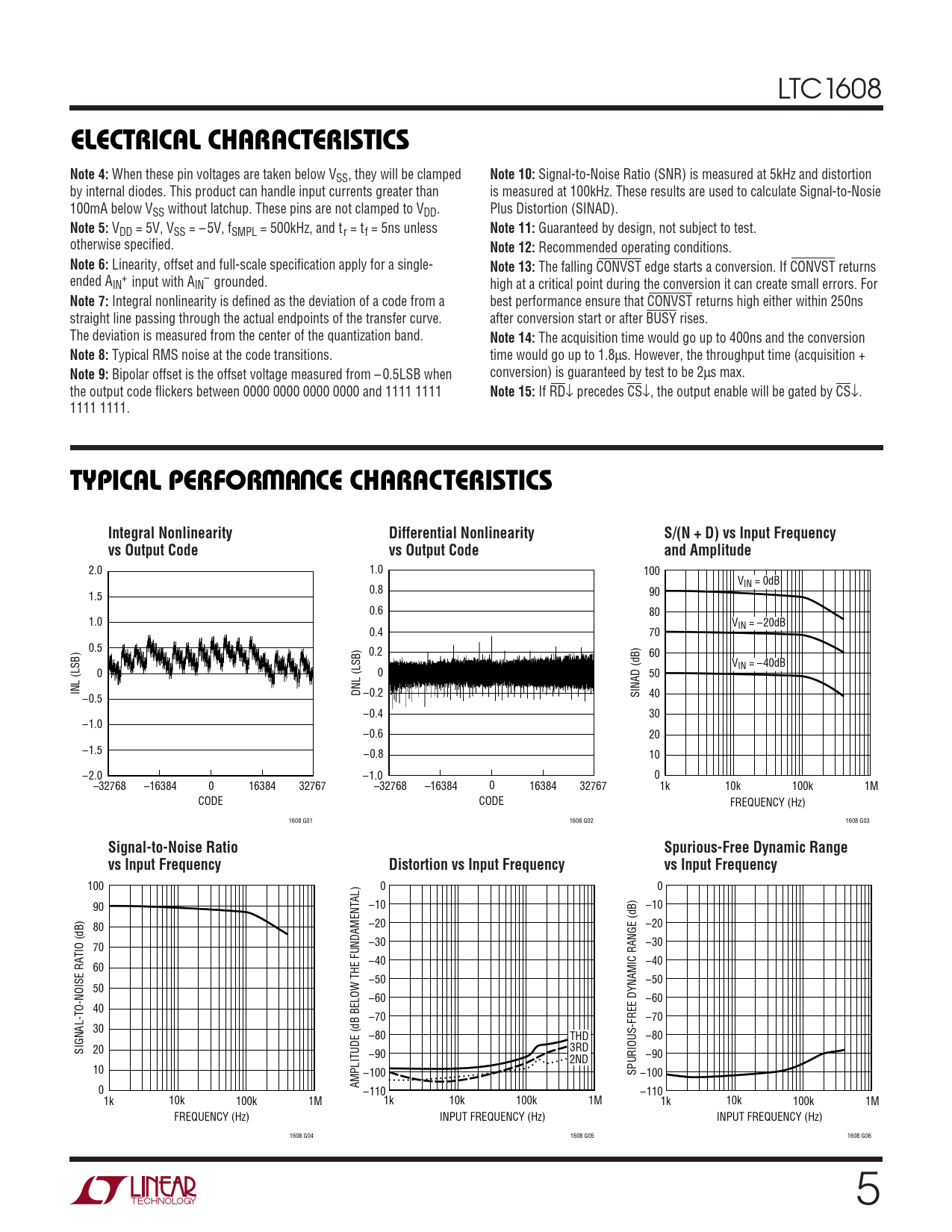 100 0 0 90 –10 –10 80 –20 –20 70 –30 –30 –40 –40 60 –50 –50 50 –60 –60 40 –70 –70 30 –80 THD –80 SIGNAL-TO-NOISE RATIO (dB) 20 3RD –90 2ND –90 10 –100 SPURIOUS-FREE DYNAMIC RANGE (dB) –100 AMPLITUDE (dB BELOW THE FUNDAMENTAL) 0 –110 –110 1k 10k 100k 1M 1k 10k 100k 1M 1k 10k 100k 1M FREQUENCY (Hz) INPUT FREQUENCY (Hz) INPUT FREQUENCY (Hz) 1608 G04 1608 G05 1608 G06 5