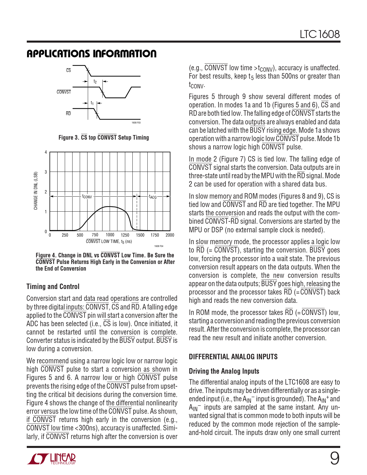LTC1608 UUWUAPPLICATIO S I FOR ATIO (e.g., CONVST low time >t CS CONV), accuracy is unaffected. For best results, keep t5 less than 500ns or greater than t2 tCONV. CONVST Figures 5 through 9 show several different modes of t1 operation. In modes 1a and 1b (Figures 5 and 6), CS and RD RD are both tied low. The falling edge of CONVST starts the 1608 F03 conversion. The data outputs are always enabled and data can be latched with the BUSY rising edge. Mode 1a shows Figure 3. CS top CONVST Setup Timing operation with a narrow logic low CONVST pulse. Mode 1b shows a narrow logic high CONVST pulse. 4 In mode 2 (Figure 7) CS is tied low. The falling edge of CONVST signal starts the conversion. Data outputs are in 3 three-state until read by the MPU with the RD signal. Mode 2 can be used for operation with a shared data bus. 2 tCONV tACQ In slow memory and ROM modes (Figures 8 and 9), CS is tied low and CONVST and RD are tied together. The MPU CHANGE IN DNL (LSB) 1 starts the conversion and reads the output with the com- bined CONVST-RD signal. Conversions are started by the 0 MPU or DSP (no external sample clock is needed). 0 250 500 750 1000 1250 1500 1750 2000 CONVST LOW TIME, t5 (ns) In slow memory mode, the processor applies a logic low 1608 F04 to RD (= CONVST), starting the conversion. BUSY goes Figure 4. Change in DNL vs CONVST Low Time. Be Sure the low, forcing the processor into a wait state. The previous CONVST Pulse Returns High Early in the Conversion or After the End of Conversion conversion result appears on the data outputs. When the conversion is complete, the new conversion results Timing and Control appear on the data outputs; BUSY goes high, releasing the processor and the processor takes RD (= CONVST) back Conversion start and data read operations are controlled high and reads the new conversion data. by three digital inputs: CONVST, CS and RD. A falling edge applied to the CONVST pin will start a conversion after the In ROM mode, the processor takes RD (= CONVST) low, ADC has been selected (i.e., CS is low). Once initiated, it starting a conversion and reading the previous conversion cannot be restarted until the conversion is complete. result. After the conversion is complete, the processor can Converter status is indicated by the BUSY output. BUSY is read the new result and initiate another conversion. low during a conversion. DIFFERENTIAL ANALOG INPUTS We recommend using a narrow logic low or narrow logic high CONVST pulse to start a conversion as shown in Driving the Analog Inputs Figures 5 and 6. A narrow low or high CONVST pulse The differential analog inputs of the LTC1608 are easy to prevents the rising edge of the CONVST pulse from upset- drive. The inputs may be driven differentially or as a single- ting the critical bit decisions during the conversion time. ended input (i.e., the A – input is grounded). The A + and Figure 4 shows the change of the differential nonlinearity IN IN A – inputs are sampled at the same instant. Any un- error versus the low time of the CONVST pulse. As shown, IN wanted signal that is common mode to both inputs will be if CONVST returns high early in the conversion (e.g., reduced by the common mode rejection of the sample- CONVST low time <300ns), accuracy is unaffected. Simi- and-hold circuit. The inputs draw only one small current larly, if CONVST returns high after the conversion is over 9
