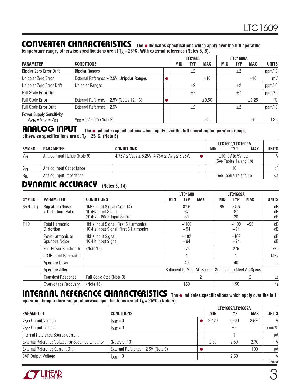 LTC1609 UCONVERTER CHARACTERISTICS The ● indicates specifications which apply over the full operatingtemperature range, otherwise specifications are at TA = 25 ° C. With external reference (Notes 5, 6).LTC1609LTC1609APARAMETERCONDITIONSMINTYPMAXMINTYPMAXUNITS Bipolar Zero Error Drift Bipolar Ranges ±2 ±2 ppm/°C Unipolar Zero Error External Reference = 2.5V, Unipolar Ranges ● ±10 ±10 mV Unipolar Zero Error Drift Unipolar Ranges ±2 ±2 ppm/°C Full-Scale Error Drift ±7 ±7 ppm/°C Full-Scale Error External Reference = 2.5V (Notes 12, 13) ● ±0.50 ±0.25 % Full-Scale Error Drift External Reference = 2.5V ±2 ±2 ppm/°C Power Supply Sensitivity V U ANA = VDIG = VDD U VDD = 5V ±5% (Note 9) ±8 ±8 LSB A ALOG I PUT The ● indicates specifications which apply over the full operating temperature range,otherwise specifications are at TA = 25 ° C. (Note 5)LTC1609/LTC1609ASYMBOLPARAMETERCONDITIONSMINTYPMAXUNITS VIN Analog Input Range (Note 9) 4.75V ≤ VANA ≤ 5.25V, 4.75V ≤ VDIG ≤ 5.25V, ● ±10, 0V to 5V, etc. V (See Tables 1a and 1b) CIN Analog Input Capacitance 10 pF RIN Analog Input Impedance See Tables 1a and 1b kΩ UWDY A IC ACCURACY (Notes 5, 14)LTC1609LTC1609ASYMBOLPARAMETERCONDITIONSMINTYPMAXMINTYPMAXUNITS S/(N + D) Signal-to-(Noise 1kHz Input Signal (Note 14) 87.5 85 87.5 dB + Distortion) Ratio 10kHz Input Signal 87 87 dB 20kHz, – 60dB Input Signal 30 30 dB THD Total Harmonic 1kHz Input Signal, First 5 Harmonics – 100 – 100 –96 dB Distortion 10kHz Input Signal, First 5 Harmonics – 94 – 94 dB Peak Harmonic or 1kHz Input Signal – 102 – 102 dB Spurious Noise 10kHz Input Signal – 94 – 94 dB Full-Power Bandwidth (Note 15) 275 275 kHz –3dB Input Bandwidth 1 1 MHz Aperture Delay 40 40 ns Aperture Jitter Sufficient to Meet AC Specs Sufficient to Meet AC Specs Transient Response Full-Scale Step (Note 9) 2 2 µs Overvoltage Recovery (Note 16) 150 150 ns UUUINTERNAL REFERENCE CHARACTERISTICS The ● indicates specifications which apply over the fulloperating temperature range, otherwise specifications are at TA = 25 ° C. (Note 5)LTC1609/LTC1609APARAMETERCONDITIONSMINTYPMAXUNITS VREF Output Voltage IOUT = 0 ● 2.470 2.500 2.520 V VREF Output Tempco IOUT = 0 ±5 ppm/°C Internal Reference Source Current 1 µA External Reference Voltage for Specified Linearity (Notes 9, 10) 2.30 2.50 2.70 V External Reference Current Drain External Reference = 2.5V (Note 9) ● 100 µA CAP Output Voltage IOUT = 0 2.50 V 1609fa 3