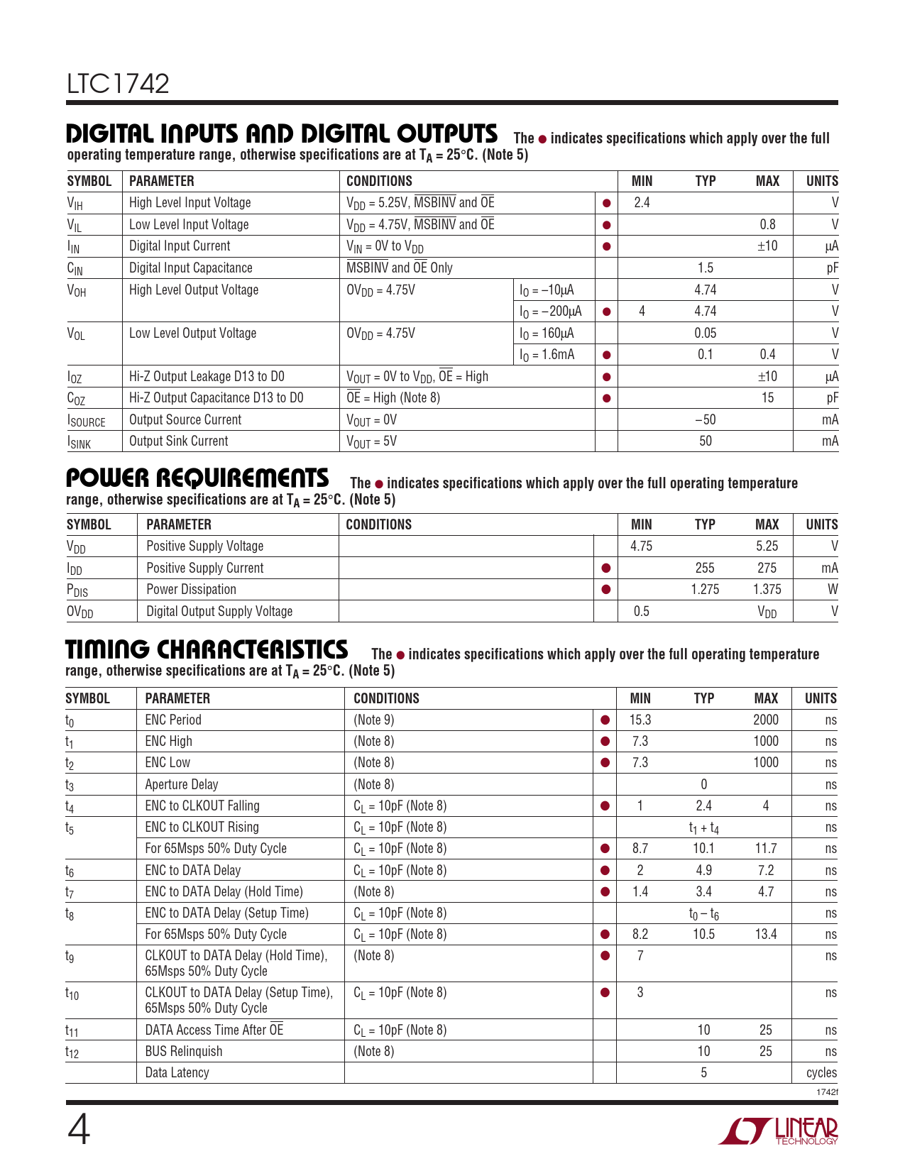 t0 ENC Period (Note 9) ● 15.3 2000 ns t1 ENC High (Note 8) ● 7.3 1000 ns t2 ENC Low (Note 8) ● 7.3 1000 ns t3 Aperture Delay (Note 8) 0 ns t4 ENC to CLKOUT Falling CL = 10pF (Note 8) ● 1 2.4 4 ns t5 ENC to CLKOUT Rising CL = 10pF (Note 8) t1 + t4 ns For 65Msps 50% Duty Cycle CL = 10pF (Note 8) ● 8.7 10.1 11.7 ns t6 ENC to DATA Delay CL = 10pF (Note 8) ● 2 4.9 7.2 ns t7 ENC to DATA Delay (Hold Time) (Note 8) ● 1.4 3.4 4.7 ns t8 ENC to DATA Delay (Setup Time) CL = 10pF (Note 8) t0 – t6 ns For 65Msps 50% Duty Cycle CL = 10pF (Note 8) ● 8.2 10.5 13.4 ns t9 CLKOUT to DATA Delay (Hold Time), (Note 8) ● 7 ns 65Msps 50% Duty Cycle t10 CLKOUT to DATA Delay (Setup Time), CL = 10pF (Note 8) ● 3 ns 65Msps 50% Duty Cycle t11 DATA Access Time After OE CL = 10pF (Note 8) 10 25 ns t12 BUS Relinquish (Note 8) 10 25 ns Data Latency 5 cycles 1742f 4