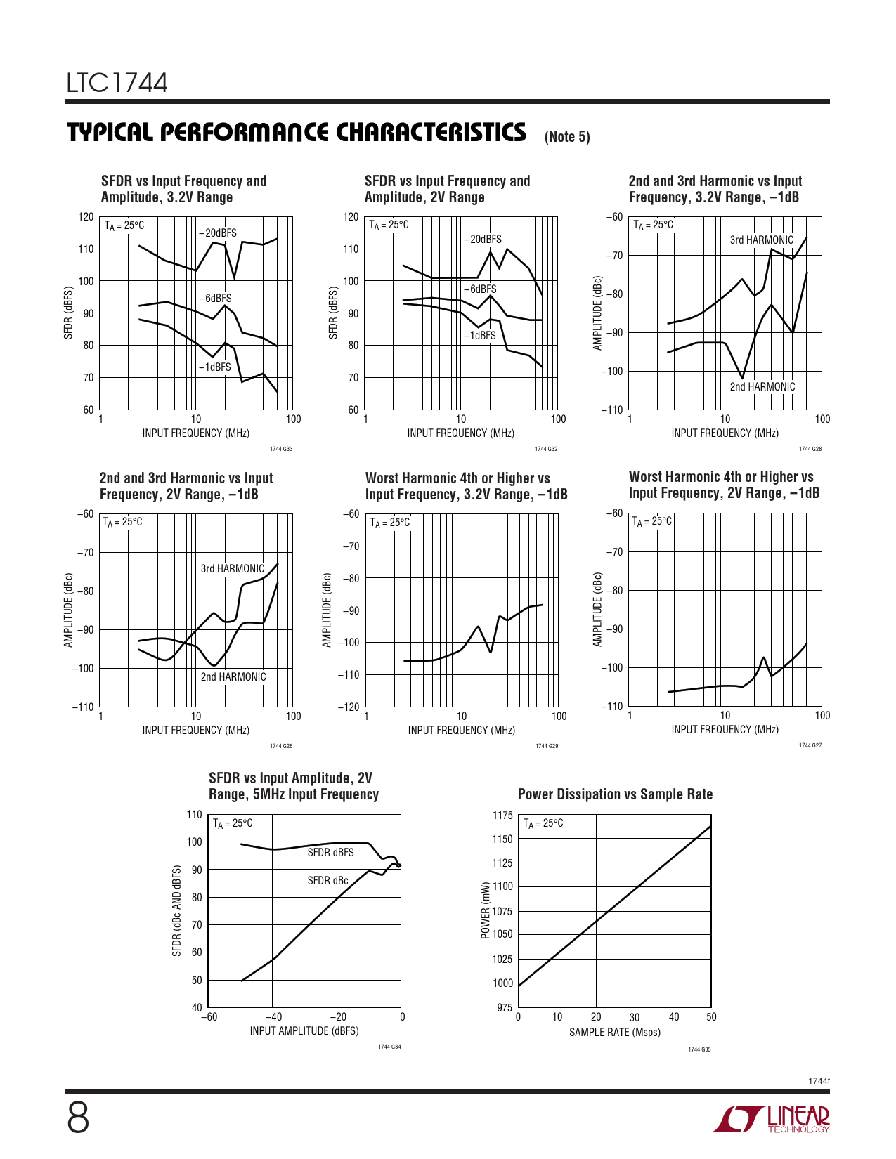 120 120 –60 T T A = 25°C A = 25°C TA = 25°C – 20dBFS – 20dBFS 3rd HARMONIC 110 110 –70 100 100 – 6dBFS – 6dBFS –80 90 90 SFDR (dBFS) SFDR (dBFS) –1dBFS –90 80 80 AMPLITUDE (dBc) –1dBFS –100 70 70 2nd HARMONIC 60 60 –110 1 10 100 1 10 100 1 10 100 INPUT FREQUENCY (MHz) INPUT FREQUENCY (MHz) INPUT FREQUENCY (MHz) 1744 G33 1744 G32 1744 G28