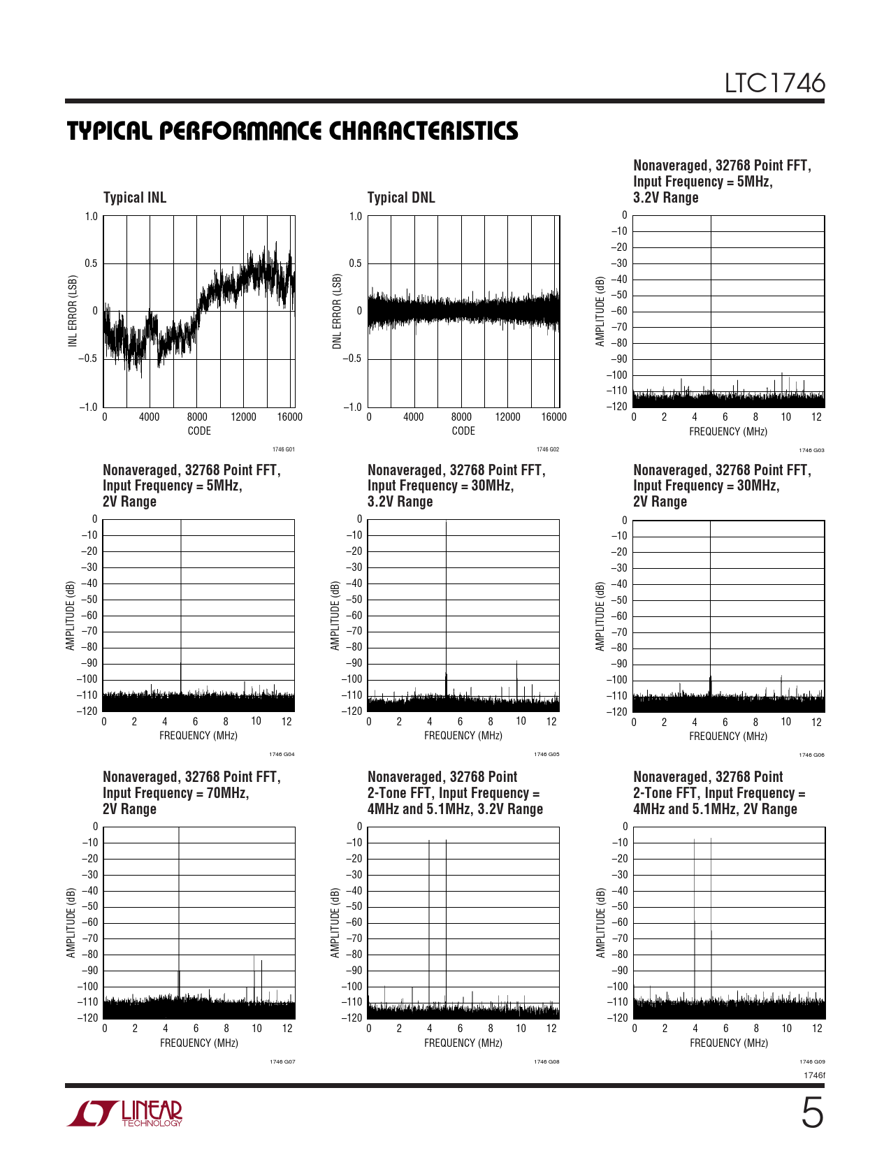 1.0 1.0 0 –10 –20 0.5 0.5 –30 –40 –50 0 0 –60 –70 INL ERROR (LSB) DNL ERROR (LSB) AMPLITUDE (dB) –80 –0.5 –0.5 –90 –100 –110 –1.0 –1.0 –120 0 4000 8000 12000 16000 0 4000 8000 12000 16000 0 2 4 6 8 10 12 CODE CODE FREQUENCY (MHz) 1746 G01 1746 G02 1746 G03