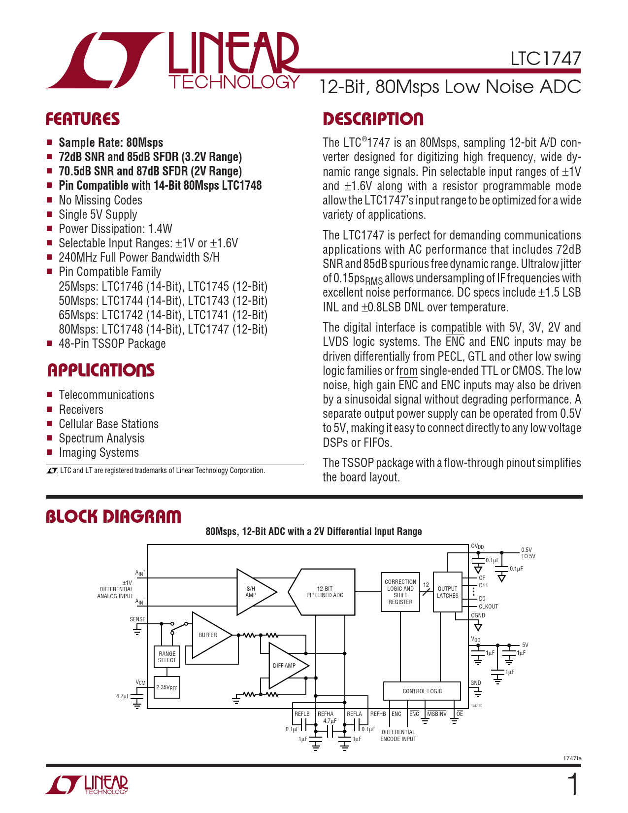 The LTC®1747 is an 80Msps, sampling 12-bit A/D con- ■