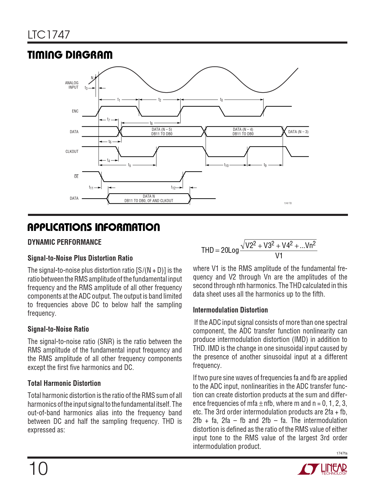 LTC1747 W UWTI I G DIAGRA N • ANALOG INPUT t3 t t 1 2 t0 ENC t7 t8 DATA (N – 5) DATA (N – 4) DATA DATA (N – 3) DB11 TO DB0 DB11 TO DB0 t6 CLKOUT t4 t5 t10 t9 OE t t 11 12 DATA N DATA DB11 TO DB0, OF AND CLKOUT 1747 TD UUWUAPPLICATIO S I FOR ATIODYNAMIC PERFORMANCE V22 V32 V42 Vn2 ... THD = + + + Log 20 Signal-to-Noise Plus Distortion Ratio V1 The signal-to-noise plus distortion ratio [S/(N + D)] is the where V1 is the RMS amplitude of the fundamental fre- ratio between the RMS amplitude of the fundamental input quency and V2 through Vn are the amplitudes of the frequency and the RMS amplitude of all other frequency second through nth harmonics. The THD calculated in this components at the ADC output. The output is band limited data sheet uses all the harmonics up to the fifth. to frequencies above DC to below half the sampling frequency. Intermodulation Distortion If the ADC input signal consists of more than one spectral Signal-to-Noise Ratio component, the ADC transfer function nonlinearity can The signal-to-noise ratio (SNR) is the ratio between the produce intermodulation distortion (IMD) in addition to RMS amplitude of the fundamental input frequency and THD. IMD is the change in one sinusoidal input caused by the RMS amplitude of all other frequency components the presence of another sinusoidal input at a different except the first five harmonics and DC. frequency. If two pure sine waves of frequencies fa and fb are applied Total Harmonic Distortion to the ADC input, nonlinearities in the ADC transfer func- Total harmonic distortion is the ratio of the RMS sum of all tion can create distortion products at the sum and differ- harmonics of the input signal to the fundamental itself. The ence frequencies of mfa ± nfb, where m and n = 0, 1, 2, 3, out-of-band harmonics alias into the frequency band etc. The 3rd order intermodulation products are 2fa + fb, between DC and half the sampling frequency. THD is 2fb + fa, 2fa – fb and 2fb – fa. The intermodulation expressed as: distortion is defined as the ratio of the RMS value of either input tone to the RMS value of the largest 3rd order intermodulation product. 1747fa 10