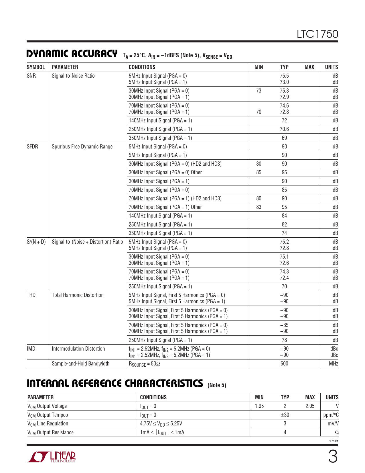 LTC1750 UWDY A IC ACCURACY TA = 25 ° C, AIN = –1dBFS (Note 5), VSENSE = VDDSYMBOLPARAMETERCONDITIONSMINTYPMAXUNITS SNR Signal-to-Noise Ratio 5MHz Input Signal (PGA = 0) 75.5 dB 5MHz Input Signal (PGA = 1) 73.0 dB 30MHz Input Signal (PGA = 0) 73 75.3 dB 30MHz Input Signal (PGA = 1) 72.9 dB 70MHz Input Signal (PGA = 0) 74.6 dB 70MHz Input Signal (PGA = 1) 70 72.8 dB 140MHz Input Signal (PGA = 1) 72 dB 250MHz Input Signal (PGA = 1) 70.6 dB 350MHz Input Signal (PGA = 1) 69 dB SFDR Spurious Free Dynamic Range 5MHz Input Signal (PGA = 0) 90 dB 5MHz Input Signal (PGA = 1) 90 dB 30MHz Input Signal (PGA = 0) (HD2 and HD3) 80 90 dB 30MHz Input Signal (PGA = 0) Other 85 95 dB 30MHz Input Signal (PGA = 1) 90 dB 70MHz Input Signal (PGA = 0) 85 dB 70MHz Input Signal (PGA = 1) (HD2 and HD3) 80 90 dB 70MHz Input Signal (PGA = 1) Other 83 95 dB 140MHz Input Signal (PGA = 1) 84 dB 250MHz Input Signal (PGA = 1) 82 dB 350MHz Input Signal (PGA = 1) 74 dB S/(N + D) Signal-to-(Noise + Distortion) Ratio 5MHz Input Signal (PGA = 0) 75.2 dB 5MHz Input Signal (PGA = 1) 72.8 dB 30MHz Input Signal (PGA = 0) 75.1 dB 30MHz Input Signal (PGA = 1) 72.6 dB 70MHz Input Signal (PGA = 0) 74.3 dB 70MHz Input Signal (PGA = 1) 72.4 dB 250MHz Input Signal (PGA = 1) 70 dB THD Total Harmonic Distortion 5MHz Input Signal, First 5 Harmonics (PGA = 0) –90 dB 5MHz Input Signal, First 5 Harmonics (PGA = 1) –90 dB 30MHz Input Signal, First 5 Harmonics (PGA = 0) –90 dB 30MHz Input Signal, First 5 Harmonics (PGA = 1) –90 dB 70MHz Input Signal, First 5 Harmonics (PGA = 0) –85 dB 70MHz Input Signal, First 5 Harmonics (PGA = 1) –90 dB 250MHz Input Signal (PGA = 1) 78 dB IMD Intermodulation Distortion fIN1 = 2.52MHz, fIN2 = 5.2MHz (PGA = 0) – 90 dBc fIN1 = 2.52MHz, fIN2 = 5.2MHz (PGA = 1) – 90 dBc Sample-and-Hold Bandwidth RSOURCE = 50Ω 500 MHz UUUI TER AL REFERE CE CHARACTERISTICS (Note 5)PARAMETERCONDITIONSMINTYPMAXUNITS VCM Output Voltage IOUT = 0 1.95 2 2.05 V VCM Output Tempco IOUT = 0 ±30 ppm/°C VCM Line Regulation 4.75V ≤ VDD ≤ 5.25V 3 mV/V VCM Output Resistance 1mA ≤ IOUT ≤ 1mA 4 Ω 1750f 3
