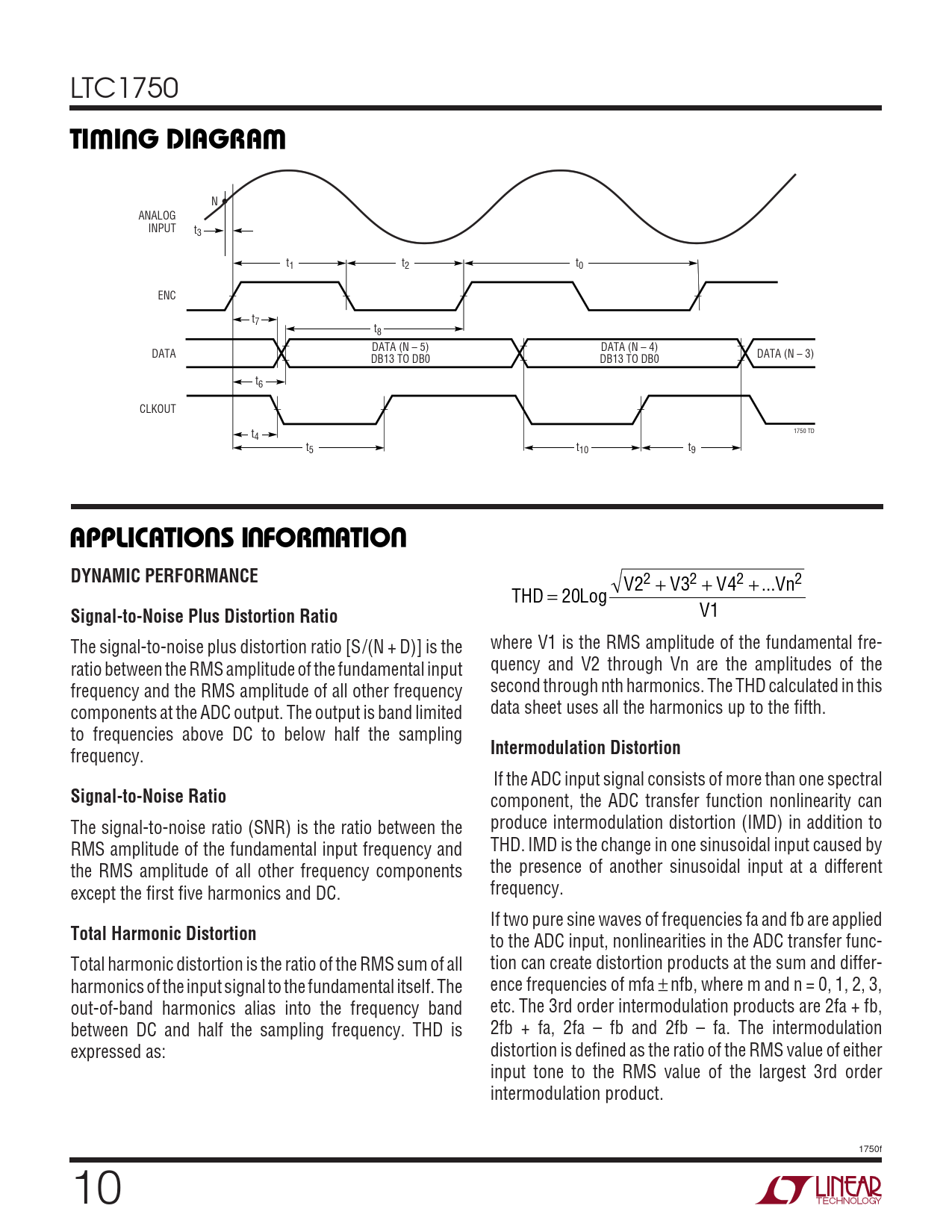 LTC1750 W UWTI I G DIAGRA N • ANALOG INPUT t3 t t 1 2 t0 ENC t7 t8 DATA (N – 5) DATA (N – 4) DATA DATA (N – 3) DB13 TO DB0 DB13 TO DB0 t6 CLKOUT 1750 TD t4 t5 t10 t9 UUWUAPPLICATIO S I FOR ATIODYNAMIC PERFORMANCE V22 V32 V42 Vn2 ... THD = + + + Log 20 Signal-to-Noise Plus Distortion Ratio V1 The signal-to-noise plus distortion ratio [S/(N + D)] is the where V1 is the RMS amplitude of the fundamental fre- ratio between the RMS amplitude of the fundamental input quency and V2 through Vn are the amplitudes of the frequency and the RMS amplitude of all other frequency second through nth harmonics. The THD calculated in this components at the ADC output. The output is band limited data sheet uses all the harmonics up to the fifth. to frequencies above DC to below half the sampling frequency. Intermodulation Distortion If the ADC input signal consists of more than one spectral Signal-to-Noise Ratio component, the ADC transfer function nonlinearity can The signal-to-noise ratio (SNR) is the ratio between the produce intermodulation distortion (IMD) in addition to RMS amplitude of the fundamental input frequency and THD. IMD is the change in one sinusoidal input caused by the RMS amplitude of all other frequency components the presence of another sinusoidal input at a different except the first five harmonics and DC. frequency. If two pure sine waves of frequencies fa and fb are applied Total Harmonic Distortion to the ADC input, nonlinearities in the ADC transfer func- Total harmonic distortion is the ratio of the RMS sum of all tion can create distortion products at the sum and differ- harmonics of the input signal to the fundamental itself. The ence frequencies of mfa ± nfb, where m and n = 0, 1, 2, 3, out-of-band harmonics alias into the frequency band etc. The 3rd order intermodulation products are 2fa + fb, between DC and half the sampling frequency. THD is 2fb + fa, 2fa – fb and 2fb – fa. The intermodulation expressed as: distortion is defined as the ratio of the RMS value of either input tone to the RMS value of the largest 3rd order intermodulation product. 1750f 10