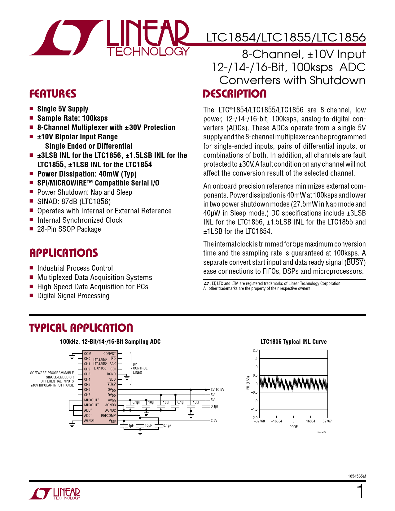 LTC1854/LTC1855/LTC1856 8-Channel, ±10V Input 12-/14-/16-Bit, 100ksps ADC Converters with Shutdown FeaTuresDescripTion n Single 5V Supply The LTC®1854/LTC1855/LTC1856 are 8-channel, low n Sample Rate: 100ksps power, 12-/14-/16-bit, 100ksps, analog-to-digital con- n 8-Channel Multiplexer with ±30V Protection verters (ADCs). These ADCs operate from a single 5V n ±10V Bipolar Input Range supply and the 8-channel multiplexer can be programmed Single Ended or Differential for single-ended inputs, pairs of differential inputs, or n ±3LSB INL for the LTC1856, ±1.5LSB INL for the combinations of both. In addition, all channels are fault LTC1855, ±1LSB INL for the LTC1854 protected to ±30V. A fault condition on any channel will not n Power Dissipation: 40mW (Typ) affect the conversion result of the selected channel. n SPI/MICROWIRE™ Compatible Serial I/O An onboard precision reference minimizes external com- n Power Shutdown: Nap and Sleep ponents. Power dissipation is 40mW at 100ksps and lower n SINAD: 87dB (LTC1856) in two power shutdown modes (27.5mW in Nap mode and n Operates with Internal or External Reference 40µW in Sleep mode.) DC specifications include ±3LSB n Internal Synchronized Clock INL for the LTC1856, ±1.5LSB INL for the LTC1855 and n 28-Pin SSOP Package ±1LSB for the LTC1854. The internal clock is trimmed for 5µs maximum conversion applicaTions time and the sampling rate is guaranteed at 100ksps. A separate convert start input and data ready signal (BUSY) n Industrial Process Control ease connections to FIFOs, DSPs and microprocessors. n Multiplexed Data Acquisition Systems L, LT, LTC and LTM are registered trademarks of Linear Technology Corporation. n High Speed Data Acquisition for PCs All other trademarks are the property of their respective owners. n Digital Signal Processing Typical applicaTion100kHz, 12-Bit/14-/16-Bit Sampling ADCLTC1856 Typical INL Curve 2.0 COM CONVST CH0 RD LTC1854/ 1.5 CH1 LTC1855/ SCK µP CH2 LTC1856 SDI CONTROL 1.0 SOFTWARE-PROGRAMMABLE CH3 DGND LINES SINGLE-ENDED OR 0.5 CH4 SDO DIFFERENTIAL INPUTS ±10V BIPOLAR INPUT RANGE CH5 BUSY 0 CH6 OVDD 3V TO 5V INL (LSB) –0.5 CH7 DVDD 5V MUXOUT+ AVDD 5V 0.1µF 10µF 10µF 0.1µF 10µF –1.0 MUXOUT– AGND3 0.1µF ADC+ AGND2 –1.5 ADC– REFCOMP –2.0 AGND1 VREF 2.5V –32768 –16384 0 16384 32767 1µF 10µF 0.1µF CODE 185456 G01 1854565af 1 Document Outline Description Typical Application Absolute Maximum Ratings Pin Configuration Typical Performance Characteristics Pin Functions Applications Information Package Description Typical Application Related Parts