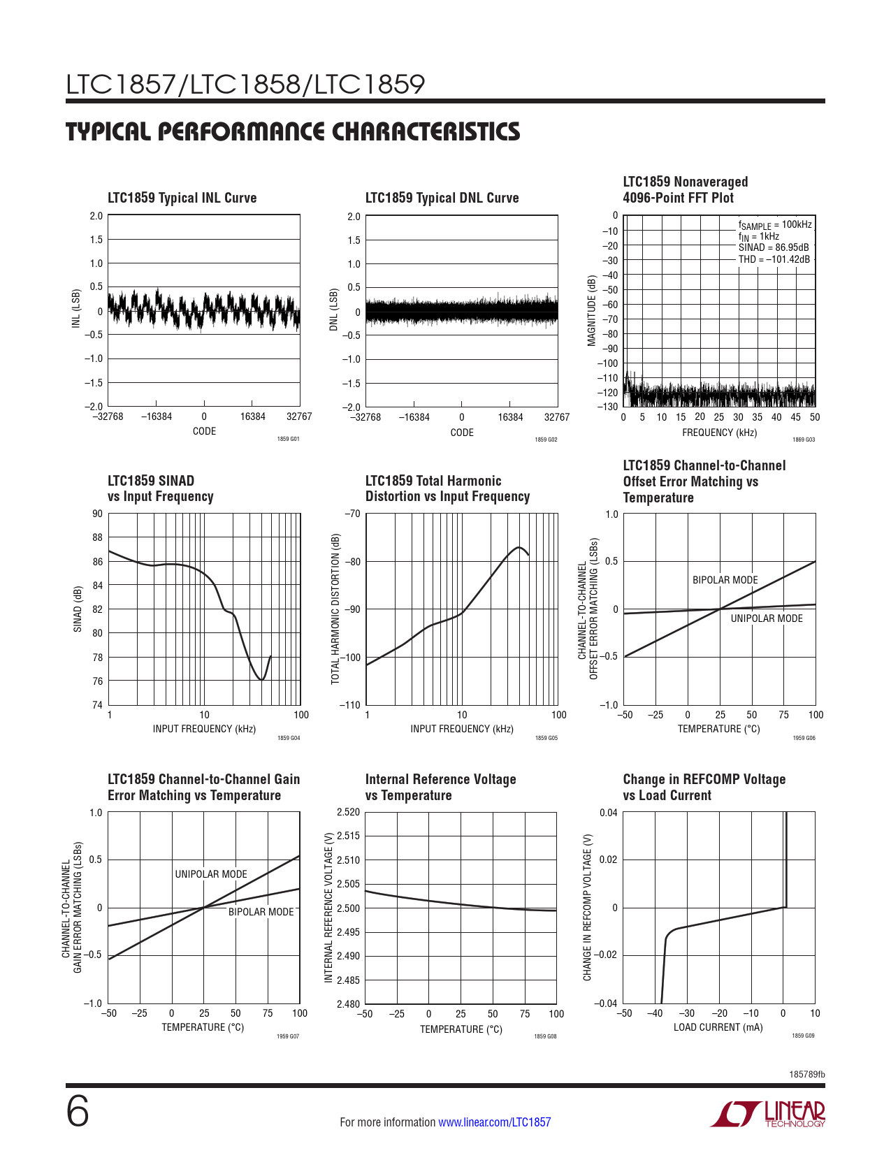 90 –70 1.0 88 86 –80 0.5 84 BIPOLAR MODE 82 –90 0 UNIPOLAR MODE SINAD (dB) 80 78 –100 CHANNEL-TO-CHANNEL –0.5 76 TOTAL HARMONIC DISTORTION (dB) OFFSET ERROR MATCHING (LSBs) 74 –110 –1.0 1 10 100 1 10 100 –50 –25 0 25 50 75 100 INPUT FREQUENCY (kHz) INPUT FREQUENCY (kHz) TEMPERATURE (°C) 1859 G04 1859 G05 1959 G06