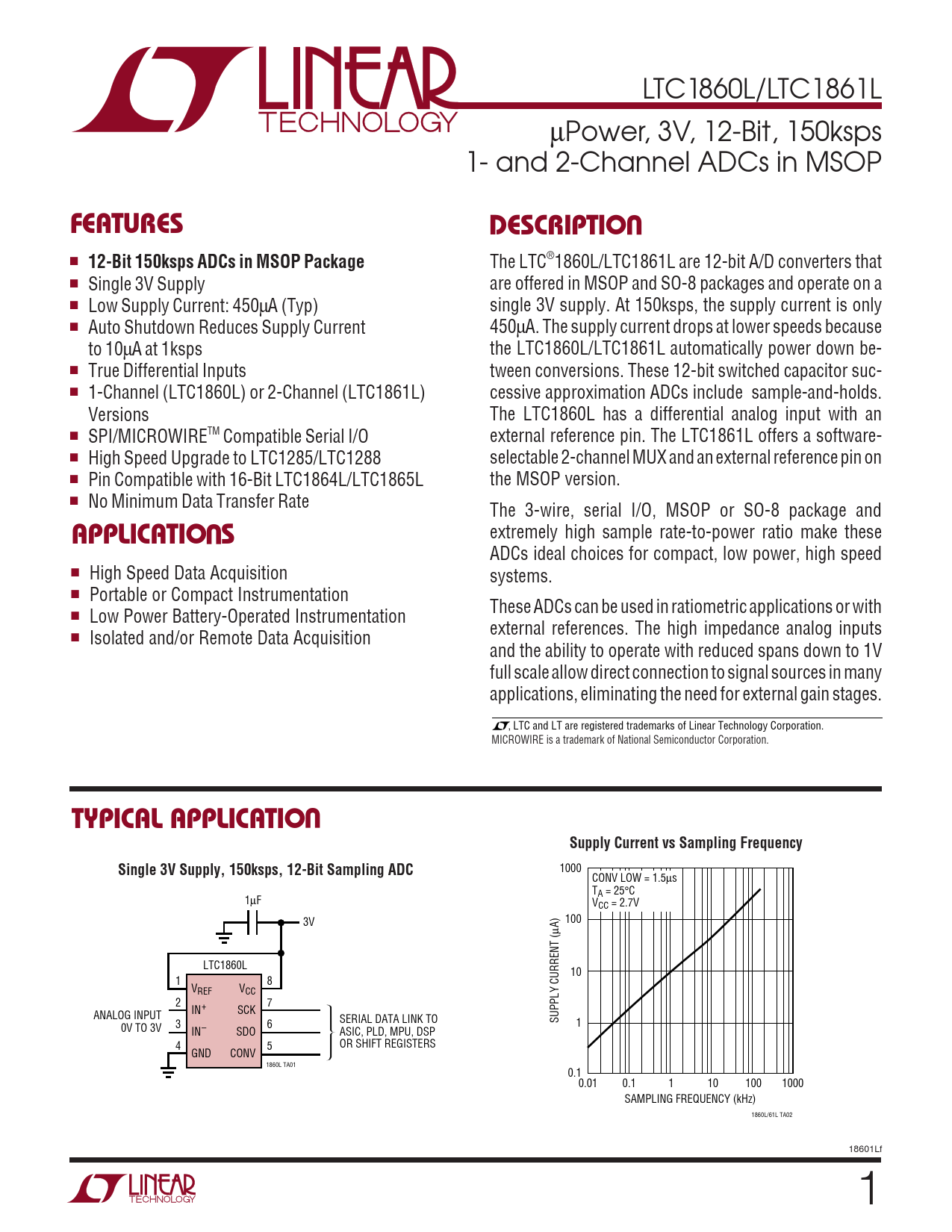 LTC1860L/LTC1861L µPower, 3V, 12-Bit, 150ksps 1- and 2-Channel ADCs in MSOP UFEATURESDESCRIPTIO ■ 12-Bit 150ksps ADCs in MSOP Package The LTC®1860L/LTC1861L are 12-bit A/D converters that ■ Single 3V Supply are offered in MSOP and SO-8 packages and operate on a ■ Low Supply Current: 450µA (Typ) single 3V supply. At 150ksps, the supply current is only ■ Auto Shutdown Reduces Supply Current 450µA. The supply current drops at lower speeds because to 10µA at 1ksps the LTC1860L/LTC1861L automatically power down be- ■ True Differential Inputs tween conversions. These 12-bit switched capacitor suc- ■ 1-Channel (LTC1860L) or 2-Channel (LTC1861L) cessive approximation ADCs include sample-and-holds. Versions The LTC1860L has a differential analog input with an ■ SPI/MICROWIRETM Compatible Serial I/O external reference pin. The LTC1861L offers a software- ■ High Speed Upgrade to LTC1285/LTC1288 selectable 2-channel MUX and an external reference pin on ■ Pin Compatible with 16-Bit LTC1864L/LTC1865L the MSOP version. ■ No Minimum Data Transfer Rate U The 3-wire, serial I/O, MSOP or SO-8 package and APPLICATIO S extremely high sample rate-to-power ratio make these ADCs ideal choices for compact, low power, high speed ■ High Speed Data Acquisition systems. ■ Portable or Compact Instrumentation These ADCs can be used in ratiometric applications or with ■ Low Power Battery-Operated Instrumentation external references. The high impedance analog inputs ■ Isolated and/or Remote Data Acquisition and the ability to operate with reduced spans down to 1V full scale allow direct connection to signal sources in many applications, eliminating the need for external gain stages. , LTC and LT are registered trademarks of Linear Technology Corporation. MICROWIRE is a trademark of National Semiconductor Corporation. UTYPICAL APPLICATIOSupply Current vs Sampling FrequencySingle 3V Supply, 150ksps, 12-Bit Sampling ADC 1000 CONV LOW = 1.5µs TA = 25°C 1µF VCC = 2.7V 3V 100 µA) LTC1860L 10 1 8 VREF VCC 2 7 IN+ SCK ANALOG INPUT 3 6 SERIAL DATA LINK TO SUPPLY CURRENT ( 1 0V TO 3V IN– SDO ASIC, PLD, MPU, DSP 4 5 OR SHIFT REGISTERS GND CONV 1860L TA01 0.1 0.01 0.1 1 10 100 1000 SAMPLING FREQUENCY (kHz) 1860L/61L TA02 18601Lf 1