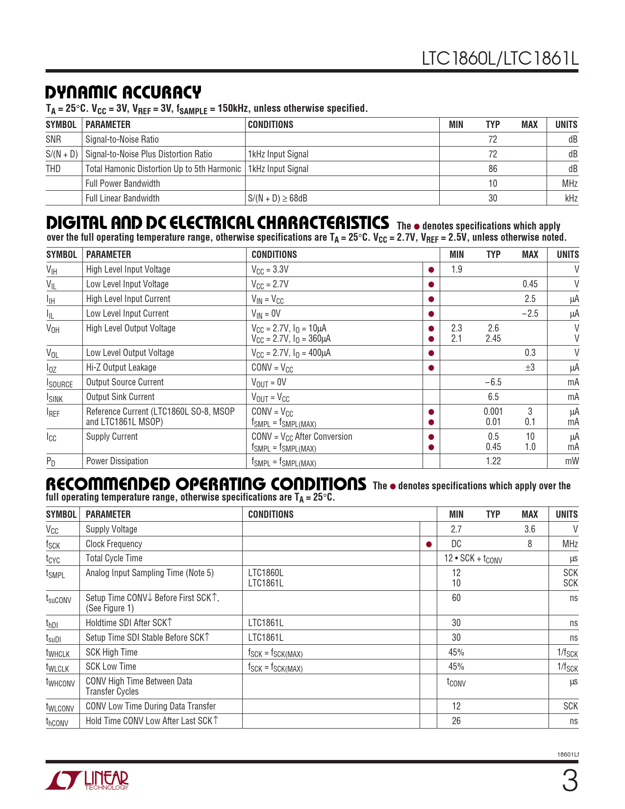 LTC1860L/LTC1861L UWDY A IC ACCURACYTA = 25 ° C. VCC = 3V, VREF = 3V, fSAMPLE = 150kHz, unless otherwise specified. SYMBOLPARAMETERCONDITIONSMINTYPMAXUNITS SNR Signal-to-Noise Ratio 72 dB S/(N + D) Signal-to-Noise Plus Distortion Ratio 1kHz Input Signal 72 dB THD Total Hamonic Distortion Up to 5th Harmonic 1kHz Input Signal 86 dB Full Power Bandwidth 10 MHz Full Linear Bandwidth S/(N + D) ≥ 68dB 30 kHz UDIGITAL A D DC ELECTRICAL CHARACTERISTICS The ● denotes specifications which applyover the full operating temperature range, otherwise specifications are TA = 25 ° C. VCC = 2.7V, VREF = 2.5V, unless otherwise noted.SYMBOLPARAMETERCONDITIONSMINTYPMAXUNITS VIH High Level Input Voltage VCC = 3.3V ● 1.9 V VIL Low Level Input Voltage VCC = 2.7V ● 0.45 V IIH High Level Input Current VIN = VCC ● 2.5 µA IIL Low Level Input Current VIN = 0V ● – 2.5 µA VOH High Level Output Voltage VCC = 2.7V, IO = 10µA ● 2.3 2.6 V VCC = 2.7V, IO = 360µA ● 2.1 2.45 V VOL Low Level Output Voltage VCC = 2.7V, IO = 400µA ● 0.3 V IOZ Hi-Z Output Leakage CONV = VCC ● ±3 µA ISOURCE Output Source Current VOUT = 0V – 6.5 mA ISINK Output Sink Current VOUT = VCC 6.5 mA IREF Reference Current (LTC1860L SO-8, MSOP CONV = VCC ● 0.001 3 µA and LTC1861L MSOP) fSMPL = fSMPL(MAX) ● 0.01 0.1 mA ICC Supply Current CONV = VCC After Conversion ● 0.5 10 µA fSMPL = fSMPL(MAX) ● 0.45 1.0 mA PD Power Dissipation fSMPL = fSMPL(MAX) 1.22 mW WWUUUURECO E DED OPERATI G CO DITIO S The ● denotes specifications which apply over thefull operating temperature range, otherwise specifications are TA = 25 ° C.SYMBOLPARAMETERCONDITIONSMINTYPMAXUNITS VCC Supply Voltage 2.7 3.6 V fSCK Clock Frequency ● DC 8 MHz tCYC Total Cycle Time 12 • SCK + tCONV µs tSMPL Analog Input Sampling Time (Note 5) LTC1860L 12 SCK LTC1861L 10 SCK tsuCONV Setup Time CONV↓ Before First SCK↑, 60 ns (See Figure 1) thDI Holdtime SDI After SCK↑ LTC1861L 30 ns tsuDI Setup Time SDI Stable Before SCK↑ LTC1861L 30 ns tWHCLK SCK High Time fSCK = fSCK(MAX) 45% 1/fSCK tWLCLK SCK Low Time fSCK = fSCK(MAX) 45% 1/fSCK tWHCONV CONV High Time Between Data tCONV µs Transfer Cycles tWLCONV CONV Low Time During Data Transfer 12 SCK thCONV Hold Time CONV Low After Last SCK↑ 26 ns 18601Lf 3