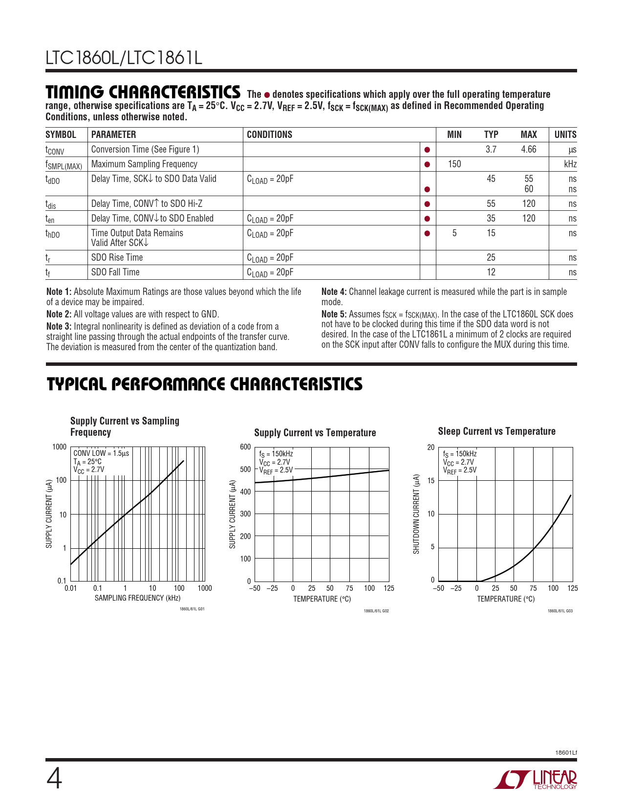 LTC1860L/LTC1861L W UTI I G CHARACTERISTICS The ● denotes specifications which apply over the full operating temperaturerange, otherwise specifications are TA = 25 ° C. VCC = 2.7V, VREF = 2.5V, fSCK = fSCK(MAX) as defined in Recommended OperatingConditions, unless otherwise noted.SYMBOLPARAMETERCONDITIONSMINTYPMAXUNITS tCONV Conversion Time (See Figure 1) ● 3.7 4.66 µs fSMPL(MAX) Maximum Sampling Frequency ● 150 kHz tdDO Delay Time, SCK↓ to SDO Data Valid CLOAD = 20pF 45 55 ns ● 60 ns tdis Delay Time, CONV↑ to SDO Hi-Z ● 55 120 ns ten Delay Time, CONV↓ to SDO Enabled CLOAD = 20pF ● 35 120 ns thDO Time Output Data Remains CLOAD = 20pF ● 5 15 ns Valid After SCK↓ tr SDO Rise Time CLOAD = 20pF 25 ns tf SDO Fall Time CLOAD = 20pF 12 ns Note 1: Absolute Maximum Ratings are those values beyond which the life Note 4: Channel leakage current is measured while the part is in sample of a device may be impaired. mode. Note 2: All voltage values are with respect to GND. Note 5: Assumes fSCK = fSCK(MAX). In the case of the LTC1860L SCK does Note 3: Integral nonlinearity is defined as deviation of a code from a not have to be clocked during this time if the SDO data word is not straight line passing through the actual endpoints of the transfer curve. desired. In the case of the LTC1861L a minimum of 2 clocks are required The deviation is measured from the center of the quantization band. on the SCK input after CONV falls to configure the MUX during this time. WUTYPICAL PERFOR A CE CHARACTERISTICSSupply Current vs Sampling FrequencySupply Current vs TemperatureSleep Current vs Temperature 1000 600 20 CONV LOW = 1.5µs f f S = 150kHz S = 150kHz TA = 25°C V V CC = 2.7V CC = 2.7V V 500 CC = 2.7V V V REF = 2.5V REF = 2.5V 100 µA) 15 µA) µA) 400 10 300 10 200 SUPPLY CURRENT ( 1 SUPPLY CURRENT ( 5 SHUTDOWN CURRENT ( 100 0.1 0 0 0.01 0.1 1 10 100 1000 –50 –25 0 25 50 75 100 125 –50 –25 0 25 50 75 100 125 SAMPLING FREQUENCY (kHz) TEMPERATURE (°C) TEMPERATURE (°C) 1860L/61L G01 1860L/61L G02 1860L/61L G03 18601Lf 4