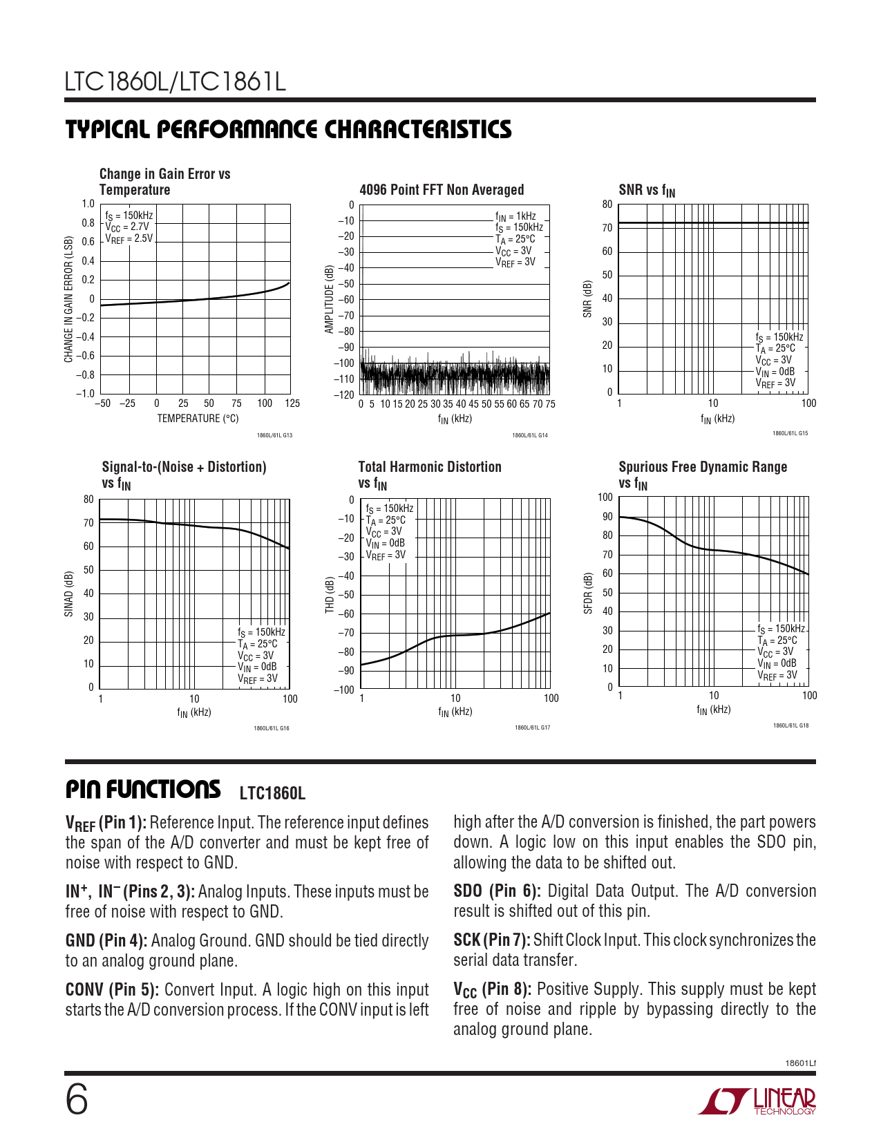 1.0 0 80 fS = 150kHz f 0.8 –10 IN = 1kHz VCC = 2.7V fS = 150kHz 70 V –20 0.6 REF = 2.5V TA = 25°C –30 VCC = 3V 60 0.4 V –40 REF = 3V 50 0.2 –50 0 –60 40 –0.2 –70 SNR (dB) 30 AMPLITUDE (dB) –80 –0.4 fS = 150kHz 20 –90 TA = 25°C CHANGE IN GAIN ERROR (LSB) –0.6 –100 VCC = 3V 10 –0.8 VIN = 0dB –110 VREF = 3V –1.0 0 –120 –50 –25 0 25 50 75 100 125 0 5 10 15 20 25 30 35 40 45 50 55 60 65 70 75 1 10 100 TEMPERATURE (°C) fIN (kHz) fIN (kHz) 1860L/61L G13 1860L/61L G14 1860L/61L G15