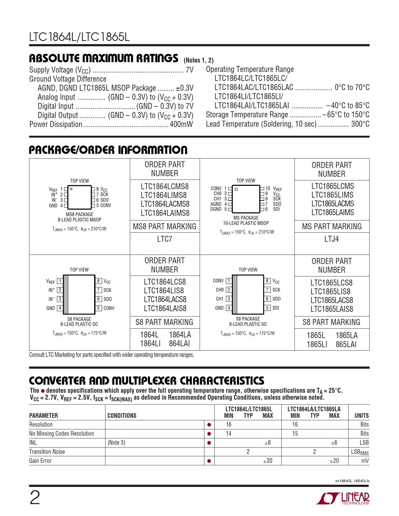 LTC1864L/LTC1865L WWWUABSOLUTE AXI U RATI GS (Notes 1, 2) Supply Voltage (V Operating Temperature Range CC) ... 7V Ground Voltage Difference LTC1864LC/LTC1865LC/ AGND, DGND LTC1865L MSOP Package ... ±0.3V LTC1864LAC/LTC1865LAC .. 0°C to 70°C Analog Input ... (GND – 0.3V) to (V LTC1864LI/LTC1865LI/ CC + 0.3V) Digital Input .. (GND – 0.3V) to 7V LTC1864LAI/LTC1865LAI ... – 40°C to 85°C Digital Output .. (GND – 0.3V) to (V Storage Temperature Range ... – 65 CC + 0.3V) °C to 150°C Power Dissipation .. 400mW Lead Temperature (Soldering, 10 sec)... 300°C UWUPACKAGE/ORDER I FOR ATIO ORDER PART ORDER PART NUMBER NUMBER TOP VIEW TOP VIEW LTC1864LCMS8 CONV 1 10 V LTC1865LCMS V 1 REF 8 VCC REF IN+ 2 7 SCK LTC1864LIMS8 CH0 2 9 VCC LTC1865LIMS IN¯ 3 6 SDO CH1 3 8 SCK GND 4 5 CONV LTC1864LACMS8 AGND 4 7 SDO LTC1865LACMS DGND 5 6 SDI MS8 PACKAGE LTC1864LAIMS8 LTC1865LAIMS 8-LEAD PLASTIC MSOP MS PACKAGE 10-LEAD PLASTIC MSOP T MS8 PART MARKING MS PART MARKING JMAX = 150°C, θJA = 210°C/W TJMAX = 150°C, θJA = 210°C/W LTC7 LTJ4 ORDER PART ORDER PART TOP VIEW NUMBER TOP VIEW NUMBER V 1 8 REF VCC LTC1864LCS8 CONV 1 8 VCC LTC1865LCS8 IN+ 2 7 SCK LTC1864LIS8 CH0 2 7 SCK LTC1865LIS8 IN– 3 6 SDO LTC1864LACS8 CH1 3 6 SDO LTC1865LACS8 GND 4 5 CONV LTC1864LAIS8 GND 4 5 SDI LTC1865LAIS8 S8 PACKAGE S8 PACKAGE 8-LEAD PLASTIC SO S8 PART MARKING 8-LEAD PLASTIC SO S8 PART MARKING TJMAX = 150°C, θJA = 175°C/W 1864L 1864LA TJMAX = 150°C, θJA = 175°C/W 1865L 1865LA 1864LI 864LAI 1865LI 865LAI Consult LTC Marketing for parts specified with wider operating temperature ranges. UUWCO VERTER A D ULTIPLEXER CHARACTERISTICSThe ● denotes specifications which apply over the full operating temperature range, otherwise specifications are TA = 25 ° C.VCC = 2.7V, VREF = 2.5V, fSCK = fSCK(MAX) as defined in Recommended Operating Conditions, unless otherwise noted. ● LTC1864L/LTC1865L LTC1864LA/LTC1865LAPARAMETERCONDITIONSMINTYPMAXMINTYPMAXUNITS Resolution ● 16 16 Bits No Missing Codes Resolution ● 14 15 Bits INL (Note 3) ● ±8 ±6 LSB Transition Noise 2 2 LSBRMS Gain Error ● ±20 ±20 mV sn18645L 18645Lfs 2