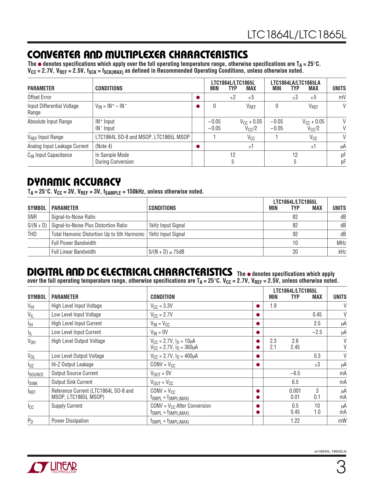 C. VCC = 2.7V, VREF = 2.5V, fSCK = fSCK(MAX) as defined in Recommended Operating Conditions, unless otherwise noted. LTC1864L/LTC1865L LTC1864LA/LTC1865LA PARAMETER CONDITIONS MIN TYP MAX MIN TYP MAX UNITS