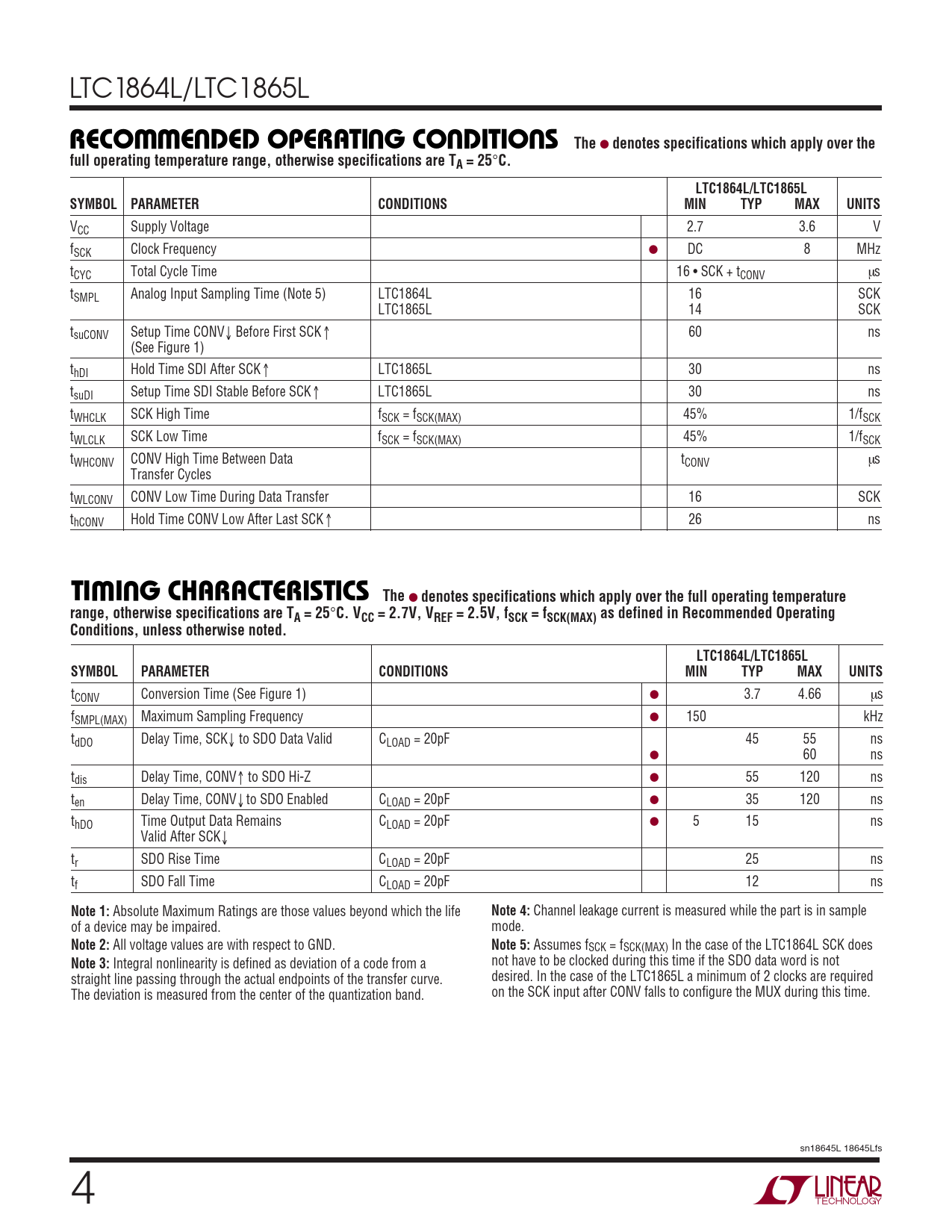 LTC1864L/LTC1865L WWUUUURECO E DED OPERATI G CO DITIO S The ● denotes specifications which apply over thefull operating temperature range, otherwise specifications are TA = 25 ° C.LTC1864L/LTC1865LSYMBOLPARAMETERCONDITIONSMINTYPMAXUNITS VCC Supply Voltage 2.7 3.6 V fSCK Clock Frequency ● DC 8 MHz tCYC Total Cycle Time 16 • SCK + tCONV µs tSMPL Analog Input Sampling Time (Note 5) LTC1864L 16 SCK LTC1865L 14 SCK tsuCONV Setup Time CONV↓ Before First SCK↑ 60 ns (See Figure 1) thDI Hold Time SDI After SCK↑ LTC1865L 30 ns tsuDI Setup Time SDI Stable Before SCK↑ LTC1865L 30 ns tWHCLK SCK High Time fSCK = fSCK(MAX) 45% 1/fSCK tWLCLK SCK Low Time fSCK = fSCK(MAX) 45% 1/fSCK tWHCONV CONV High Time Between Data tCONV µs Transfer Cycles tWLCONV CONV Low Time During Data Transfer 16 SCK thCONV Hold Time CONV Low After Last SCK↑ 26 ns W UTI I G CHARACTERISTICS The ● denotes specifications which apply over the full operating temperaturerange, otherwise specifications are TA = 25 ° C. VCC = 2.7V, VREF = 2.5V, fSCK = fSCK(MAX) as defined in Recommended OperatingConditions, unless otherwise noted.LTC1864L/LTC1865LSYMBOLPARAMETERCONDITIONSMINTYPMAXUNITS tCONV Conversion Time (See Figure 1) ● 3.7 4.66 µs fSMPL(MAX) Maximum Sampling Frequency ● 150 kHz tdDO Delay Time, SCK↓ to SDO Data Valid CLOAD = 20pF 45 55 ns ● 60 ns tdis Delay Time, CONV↑ to SDO Hi-Z ● 55 120 ns ten Delay Time, CONV↓ to SDO Enabled CLOAD = 20pF ● 35 120 ns thDO Time Output Data Remains CLOAD = 20pF ● 5 15 ns Valid After SCK↓ tr SDO Rise Time CLOAD = 20pF 25 ns tf SDO Fall Time CLOAD = 20pF 12 ns Note 1: Absolute Maximum Ratings are those values beyond which the life Note 4: Channel leakage current is measured while the part is in sample of a device may be impaired. mode. Note 2: All voltage values are with respect to GND. Note 5: Assumes fSCK = fSCK(MAX) In the case of the LTC1864L SCK does Note 3: Integral nonlinearity is defined as deviation of a code from a not have to be clocked during this time if the SDO data word is not straight line passing through the actual endpoints of the transfer curve. desired. In the case of the LTC1865L a minimum of 2 clocks are required The deviation is measured from the center of the quantization band. on the SCK input after CONV falls to configure the MUX during this time. sn18645L 18645Lfs 4