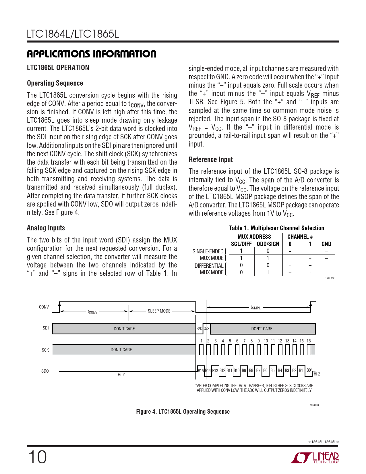 LTC1864L/LTC1865L UUWUAPPLICATIO S I FOR ATIOLTC1865L OPERATION single-ended mode, all input channels are measured with respect to GND. A zero code will occur when the “+” input Operating Sequence minus the “–” input equals zero. Full scale occurs when The LTC1865L conversion cycle begins with the rising the “+” input minus the “–” input equals VREF minus edge of CONV. After a period equal to t 1LSB. See Figure 5. Both the “+” and “–” inputs are CONV, the conver- sion is finished. If CONV is left high after this time, the sampled at the same time so common mode noise is LTC1865L goes into sleep mode drawing only leakage rejected. The input span in the SO-8 package is fixed at current. The LTC1865L’s 2-bit data word is clocked into VREF = VCC. If the “–” input in differential mode is the SDI input on the rising edge of SCK after CONV goes grounded, a rail-to-rail input span will result on the “+” low. Additional inputs on the SDI pin are then ignored until input. the next CONV cycle. The shift clock (SCK) synchronizes the data transfer with each bit being transmitted on the Reference Input falling SCK edge and captured on the rising SCK edge in The reference input of the LTC1865L SO-8 package is both transmitting and receiving systems. The data is internally tied to VCC. The span of the A/D converter is transmitted and received simultaneously (full duplex). therefore equal to VCC. The voltage on the reference input After completing the data transfer, if further SCK clocks of the LTC1865L MSOP package defines the span of the are applied with CONV low, SDO will output zeros indefi- A/D converter. The LTC1865L MSOP package can operate nitely. See Figure 4. with reference voltages from 1V to VCC. Analog InputsTable 1. Multiplexer Channel Selection The two bits of the input word (SDI) assign the MUX MUX ADDRESSCHANNEL #SGL/DIFFODD/SIGN01GND configuration for the next requested conversion. For a SINGLE-ENDED 1 0 + – given channel selection, the converter will measure the MUX MODE 1 1 + – voltage between the two channels indicated by the DIFFERENTIAL 0 0 + – “+” and “–” signs in the selected row of Table 1. In MUX MODE 0 1 – + 1864 TBL1 CONV tSMPL tCONV SLEEP MODE SDI DON’T CARE S/D O/S DON’T CARE 1 2 3 4 5 6 7 8 9 10 11 12 13 14 15 16 SCK DON'T CARE SDO B15 B14 B13 B12 B11 B10 B9 B8 B7 B6 B5 B4 B3 B2 B1 B0* Hi-Z Hi-Z *AFTER COMPLETING THE DATA TRANSFER, IF FURTHER SCK CLOCKS ARE APPLIED WITH CONV LOW, THE ADC WILL OUTPUT ZEROS INDEFINITELY 1864 F04 Figure 4. LTC1865L Operating Sequence sn18645L 18645Lfs 10