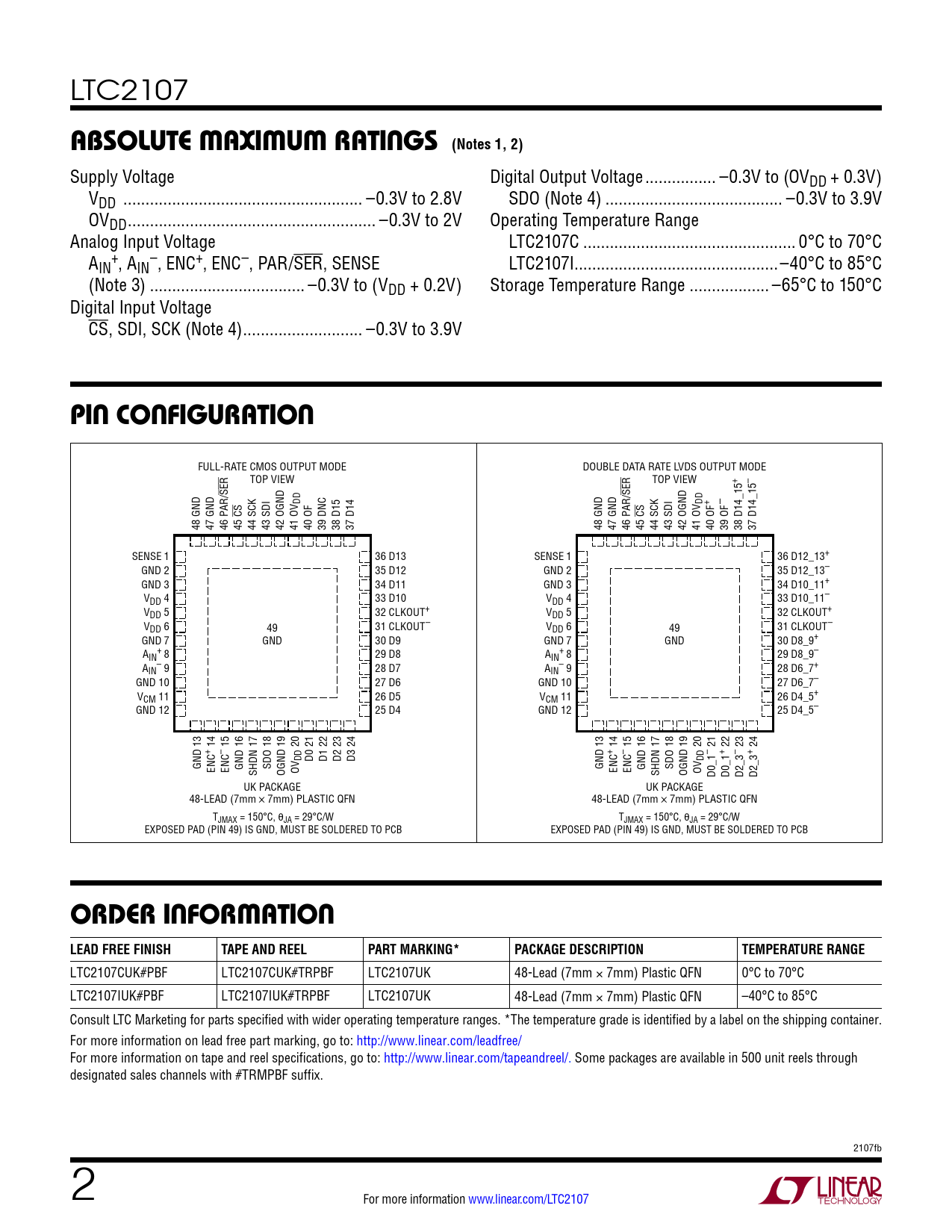 LTC2107CUK#PBF LTC2107CUK#TRPBF LTC2107UK 48-Lead (7mm × 7mm) Plastic QFN 0°C to 70°C LTC2107IUK#PBF LTC2107IUK#TRPBF LTC2107UK 48-Lead (7mm × 7mm) Plastic QFN –40°C to 85°C Consult LTC Marketing for parts specified with wider operating temperature ranges. *The temperature grade is identified by a label on the shipping container. For more information on lead free part marking, go to: http://www.linear.com/leadfree/ For more information on tape and reel specifications, go to: http://www.linear.com/tapeandreel/. Some packages are available in 500 unit reels through designated sales channels with #TRMPBF suffix. 2107fb 2 For more information www.linear.com/LTC2107 Document Outline Features Applications Description Block Diagram Absolute Maximum Ratings Pin Configuration Order Information Converter Characteristics Analog Input Dynamic Accuracy VCM Output Digital Inputs and OUtputs Power Requirements Timing Characteristics Timing Diagrams Typical Performance Characteristics Pin Functions Block Diagram Applications Information Package Description Typical Application Related Parts