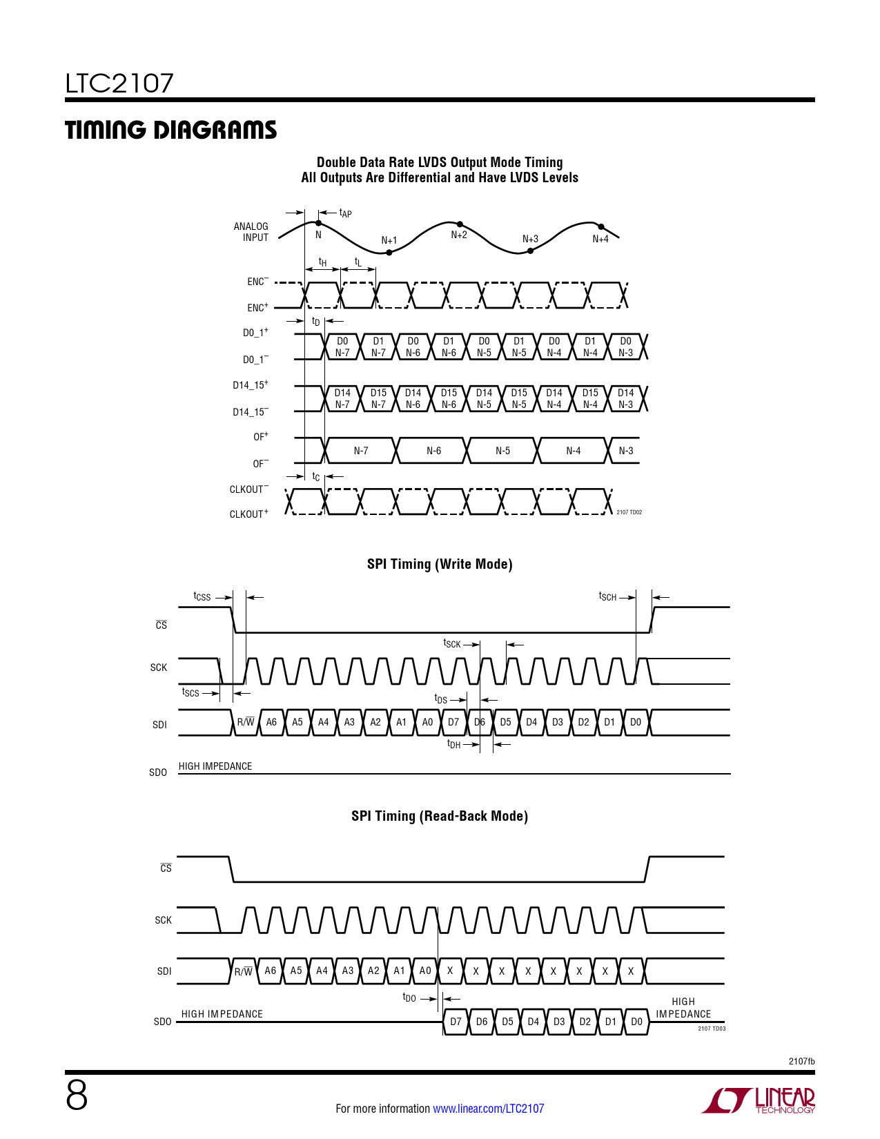 CS SCK SDI R/W A6 A5 A4 A3 A2 A1 A0 X X X X X X X X tDO HIGH HIGH IM PEDANCE IM PEDANCE SDO D7 D6 D5 D4 D3 D2 D1 D0 2107 TD03 2107fb 8 For more information www.linear.com/LTC2107 Document Outline Features Applications Description Block Diagram Absolute Maximum Ratings Pin Configuration Order Information Converter Characteristics Analog Input Dynamic Accuracy VCM Output Digital Inputs and OUtputs Power Requirements Timing Characteristics Timing Diagrams Typical Performance Characteristics Pin Functions Block Diagram Applications Information Package Description Typical Application Related Parts