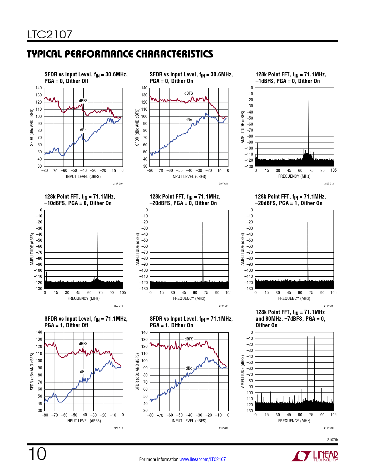 140 140 0 130 130 dBFS –10 120 dBFS 120 –20 –30 110 110 –40 100 100 dBc –50 90 90 –60 80 dBc 80 –70 70 70 –80 SFDR (dBc AND dBFS) AMPLITUDE (dBFS) –90 60 SFDR (dBc AND dBFS) 60 –100 50 50 –110 40 40 –120 30 30 –130 –80 –70 –60 –50 –40 –30 –20 –10 0 –80 –70 –60 –50 –40 –30 –20 –10 0 0 15 30 45 60 75 90 105 INPUT LEVEL (dBFS) INPUT LEVEL (dBFS) FREQUENCY (MHz) 2107 G10 2107 G11 2107 G12