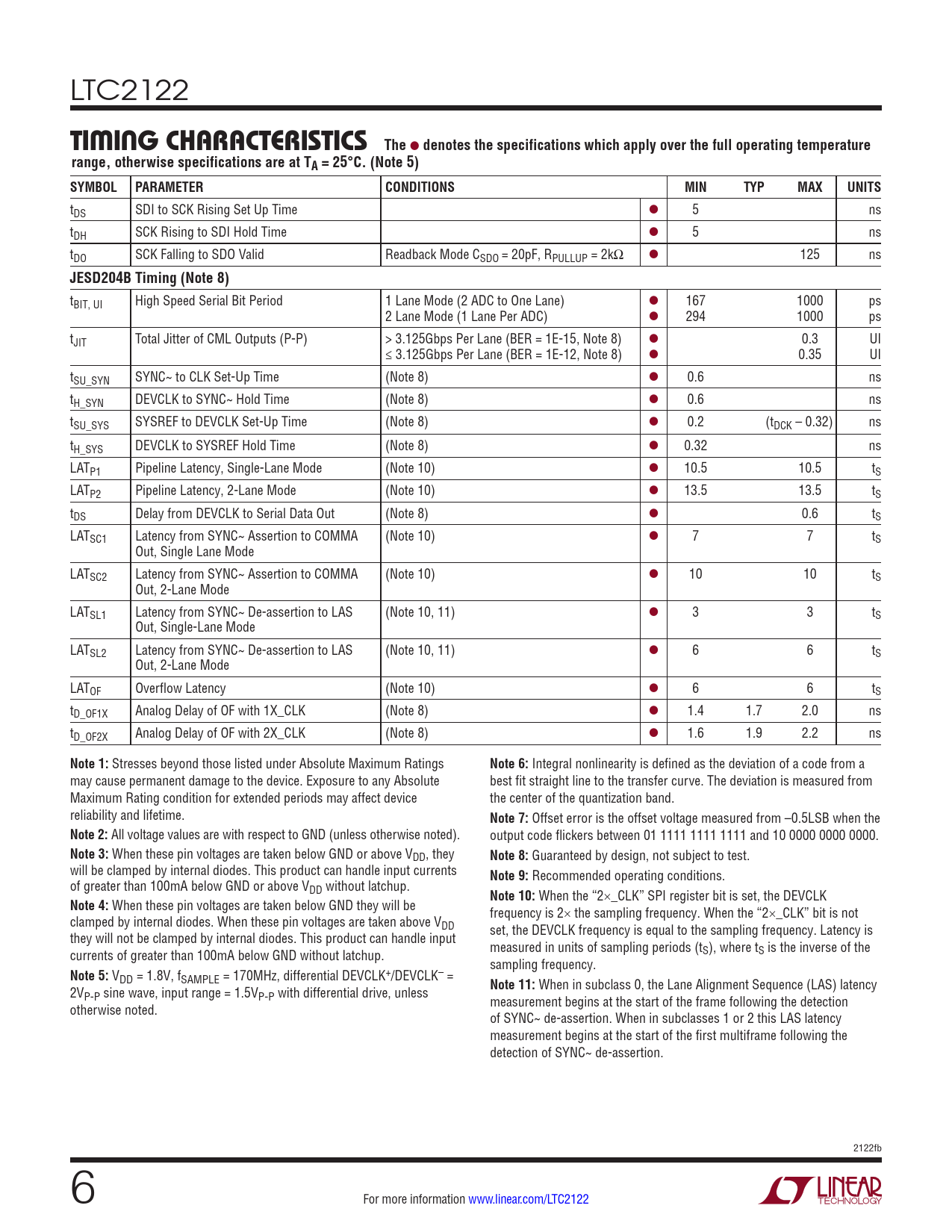 When in subclass 0, the Lane Alignment Sequence (LAS) latency P-P sine wave, input range = 1.5VP-P with differential drive, unless otherwise noted. measurement begins at the start of the frame following the detection of SYNC~ de-assertion. When in subclasses 1 or 2 this LAS latency measurement begins at the start of the first multiframe following the detection of SYNC~ de-assertion. 2122fb 6 For more information www.linear.com/LTC2122 Document Outline Features Applications Typical Application Description Absolute Maximum Ratings Order Information Pin Configuration Converter Characteristics Analog Input Dynamic Accuracy Internal Reference Characteristics Power Requirements Digital Inputs And Outputs Digital Inputs And Outputs Timing characteristics Typical Performance Characteristics Pin Functions Block Diagram Timing Diagram SPI Timing Definitions ADC PERFORMANCE TERMS SERIAL INTERFACE TERMS Applications Information CONVERTER OPERATION INPUT DRIVE CIRCUITS GROUNDING AND BYPASSING HEAT TRANSFER Typical Applications Package Description Revision History Typical Application Related Parts