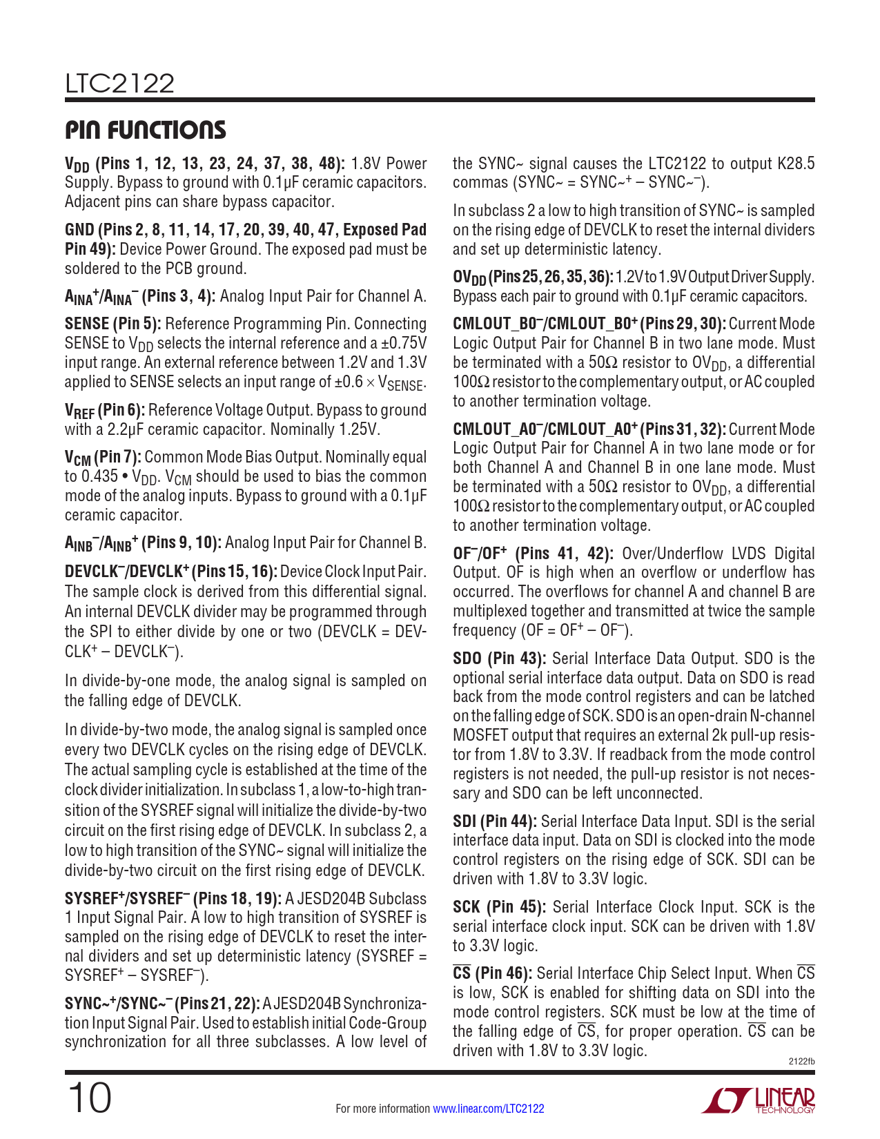 LTC2122 PIN FUNCTIONS VDD (Pins 1, 12, 13, 23, 24, 37, 38, 48): 1.8V Power the SYNC~ signal causes the LTC2122 to output K28.5 Supply. Bypass to ground with 0.1µF ceramic capacitors. commas (SYNC~ = SYNC~+ – SYNC~–). Adjacent pins can share bypass capacitor. In subclass 2 a low to high transition of SYNC~ is sampled GND (Pins 2, 8, 11, 14, 17, 20, 39, 40, 47, Exposed Pad on the rising edge of DEVCLK to reset the internal dividers Pin 49): Device Power Ground. The exposed pad must be and set up deterministic latency. soldered to the PCB ground. OVDD (Pins 25, 26, 35, 36): 1.2V to 1.9V Output Driver Supply. A +–INA /AINA (Pins 3, 4): Analog Input Pair for Channel A. Bypass each pair to ground with 0.1μF ceramic capacitors. SENSE (Pin 5): Reference Programming Pin. Connecting CMLOUT_B0–/CMLOUT_B0+ (Pins 29, 30): Current Mode SENSE to VDD selects the internal reference and a ±0.75V Logic Output Pair for Channel B in two lane mode. Must input range. An external reference between 1.2V and 1.3V be terminated with a 50Ω resistor to OVDD, a differential applied to SENSE selects an input range of ±0.6 × VSENSE. 100Ω resistor to the complementary output, or AC coupled V to another termination voltage. REF (Pin 6): Reference Voltage Output. Bypass to ground with a 2.2μF ceramic capacitor. Nominally 1.25V. CMLOUT_A0–/CMLOUT_A0+ (Pins 31, 32): Current Mode V Logic Output Pair for Channel A in two lane mode or for CM (Pin 7): Common Mode Bias Output. Nominally equal to 0.435 • V both Channel A and Channel B in one lane mode. Must DD. VCM should be used to bias the common mode of the analog inputs. Bypass to ground with a 0.1μF be terminated with a 50Ω resistor to OVDD, a differential ceramic capacitor. 100Ω resistor to the complementary output, or AC coupled to another termination voltage. A –+INB /AINB (Pins 9, 10): Analog Input Pair for Channel B. OF–/OF+ (Pins 41, 42): Over/Underflow LVDS Digital DEVCLK–/DEVCLK+ (Pins 15, 16): Device Clock Input Pair. Output. OF is high when an overflow or underflow has The sample clock is derived from this differential signal. occurred. The overflows for channel A and channel B are An internal DEVCLK divider may be programmed through multiplexed together and transmitted at twice the sample the SPI to either divide by one or two (DEVCLK = DEV- frequency (OF = OF+ – OF–). CLK+ – DEVCLK–). SDO (Pin 43): Serial Interface Data Output. SDO is the In divide-by-one mode, the analog signal is sampled on optional serial interface data output. Data on SDO is read the falling edge of DEVCLK. back from the mode control registers and can be latched on the falling edge of SCK. SDO is an open-drain N-channel In divide-by-two mode, the analog signal is sampled once MOSFET output that requires an external 2k pull-up resis- every two DEVCLK cycles on the rising edge of DEVCLK. tor from 1.8V to 3.3V. If readback from the mode control The actual sampling cycle is established at the time of the registers is not needed, the pull-up resistor is not neces- clock divider initialization. In subclass 1, a low-to-high tran- sary and SDO can be left unconnected. sition of the SYSREF signal will initialize the divide-by-two circuit on the first rising edge of DEVCLK. In subclass 2, a SDI (Pin 44): Serial Interface Data Input. SDI is the serial low to high transition of the SYNC~ signal will initialize the interface data input. Data on SDI is clocked into the mode control registers on the rising edge of SCK. SDI can be divide-by-two circuit on the first rising edge of DEVCLK. driven with 1.8V to 3.3V logic. SYSREF+/SYSREF– (Pins 18, 19): A JESD204B Subclass SCK (Pin 45): Serial Interface Clock Input. SCK is the 1 Input Signal Pair. A low to high transition of SYSREF is serial interface clock input. SCK can be driven with 1.8V sampled on the rising edge of DEVCLK to reset the inter- to 3.3V logic. nal dividers and set up deterministic latency (SYSREF = SYSREF+ – SYSREF–). CS (Pin 46): Serial Interface Chip Select Input. When CS is low, SCK is enabled for shifting data on SDI into the SYNC~+/SYNC~– (Pins 21, 22): A JESD204B Synchroniza- mode control registers. SCK must be low at the time of tion Input Signal Pair. Used to establish initial Code-Group the falling edge of CS, for proper operation. CS can be synchronization for all three subclasses. A low level of driven with 1.8V to 3.3V logic. 2122fb 10 For more information www.linear.com/LTC2122 Document Outline Features Applications Typical Application Description Absolute Maximum Ratings Order Information Pin Configuration Converter Characteristics Analog Input Dynamic Accuracy Internal Reference Characteristics Power Requirements Digital Inputs And Outputs Digital Inputs And Outputs Timing characteristics Typical Performance Characteristics Pin Functions Block Diagram Timing Diagram SPI Timing Definitions ADC PERFORMANCE TERMS SERIAL INTERFACE TERMS Applications Information CONVERTER OPERATION INPUT DRIVE CIRCUITS GROUNDING AND BYPASSING HEAT TRANSFER Typical Applications Package Description Revision History Typical Application Related Parts