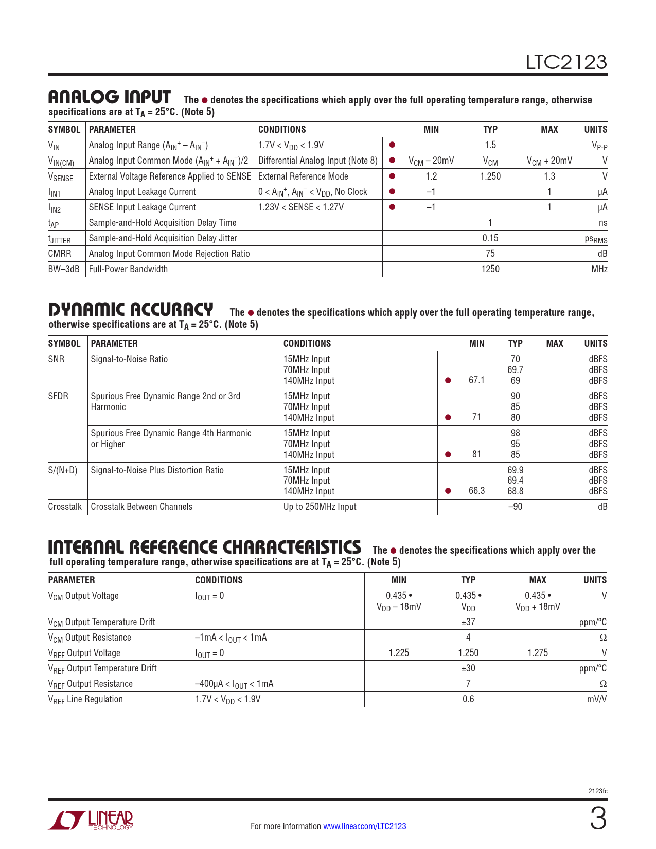 V + – IN Analog Input Range (AIN – AIN ) 1.7V < VDD < 1.9V l 1.5 VP-P V + – IN(CM) Analog Input Common Mode (AIN + AIN )/2 Differential Analog Input (Note 8) l VCM – 20mV VCM VCM + 20mV V VSENSE External Voltage Reference Applied to SENSE External Reference Mode l 1.2 1.250 1.3 V I + – IN1 Analog Input Leakage Current 0 < AIN , AIN < VDD, No Clock l –1 1 µA IIN2 SENSE Input Leakage Current 1.23V < SENSE < 1.27V l –1 1 µA tAP Sample-and-Hold Acquisition Delay Time 1 ns tJITTER Sample-and-Hold Acquisition Delay Jitter 0.15 psRMS CMRR Analog Input Common Mode Rejection Ratio 75 dB BW–3dB Full-Power Bandwidth 1250 MHz