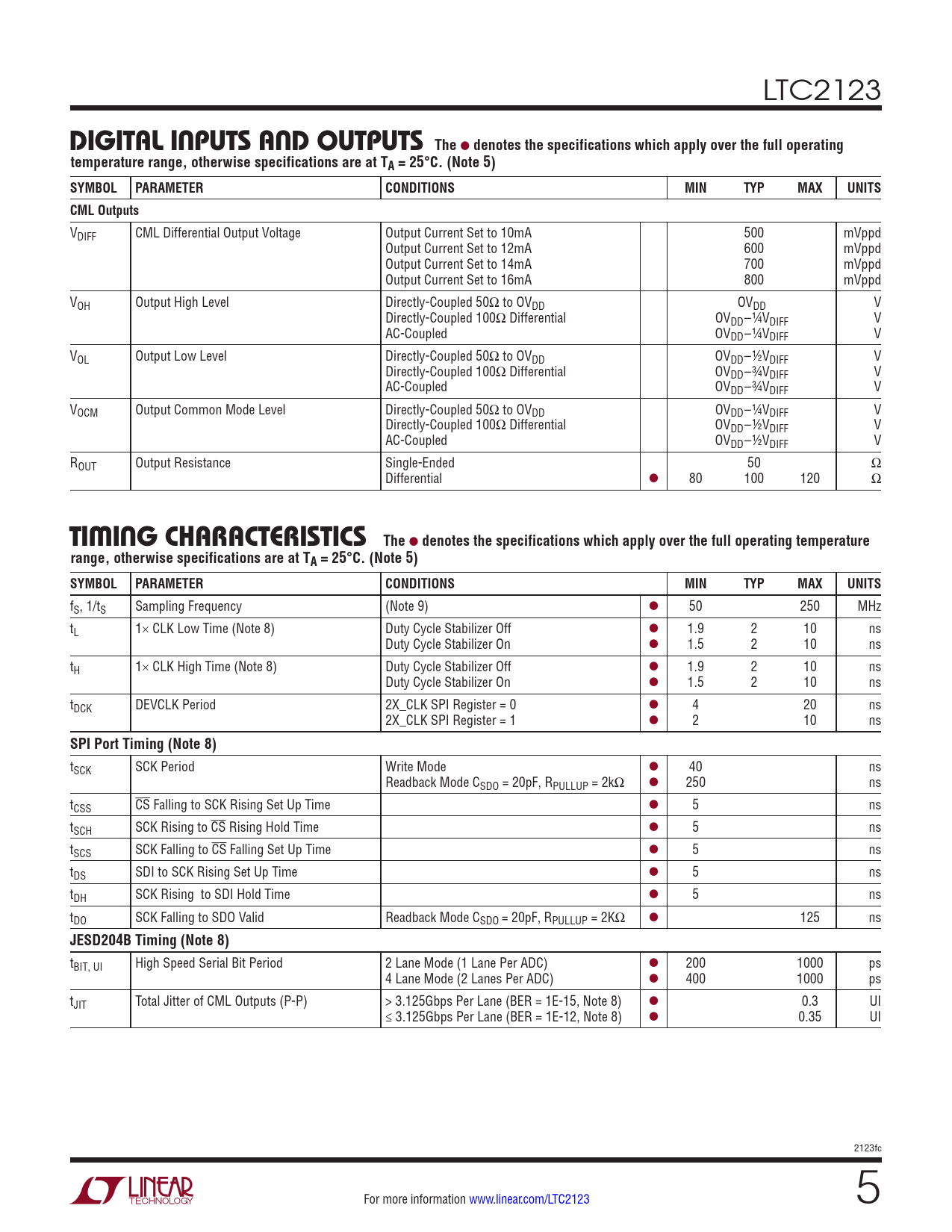 tBIT, UI High Speed Serial Bit Period 2 Lane Mode (1 Lane Per ADC) l 200 1000 ps 4 Lane Mode (2 Lanes Per ADC) l 400 1000 ps tJIT Total Jitter of CML Outputs (P-P) > 3.125Gbps Per Lane (BER = 1E-15, Note 8) l 0.3 UI ≤ 3.125Gbps Per Lane (BER = 1E-12, Note 8) l 0.35 UI 2123fc For more information www.linear.com/LTC2123 5 Document Outline Features Applications Typical Application Description Absolute Maximum Ratings Order Information Converter Characteristics Pin Configuration Analog Input Dynamic Accuracy Internal Reference Characteristics Power Requirements Digital Inputs and Outputs Timing Characteristics Typical Performance Characteristics Pin Functions Block Diagram Timing Diagram SPI Timing Definitions Applications Information Typical Applications Package Description Typical Application Related Parts