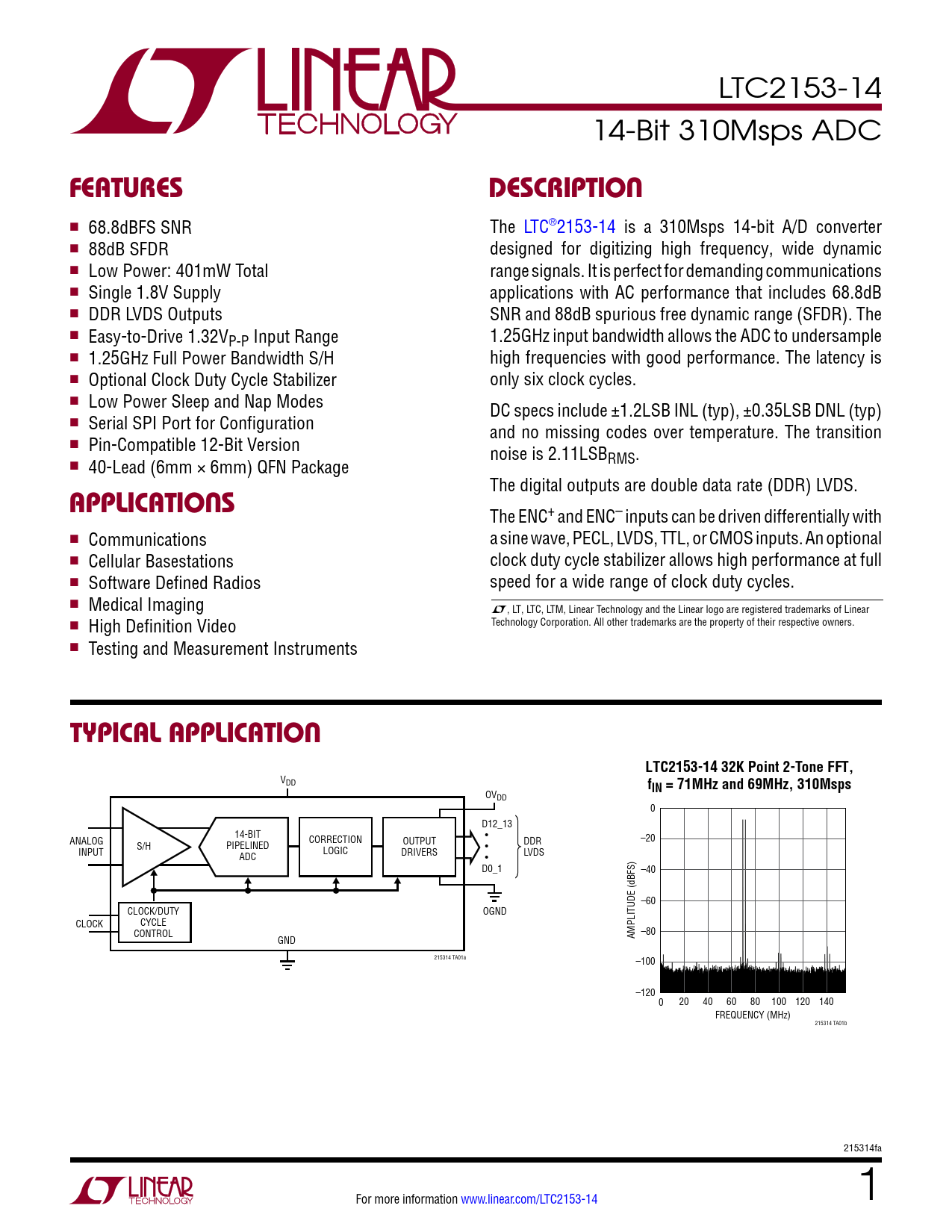 LTC2153-14 14-Bit 310Msps ADC FeaTuresDescripTion n 68.8dBFS SNR The LTC®2153-14 is a 310Msps 14-bit A/D converter n 88dB SFDR designed for digitizing high frequency, wide dynamic n Low Power: 401mW Total range signals. It is perfect for demanding communications n Single 1.8V Supply applications with AC performance that includes 68.8dB n DDR LVDS Outputs SNR and 88dB spurious free dynamic range (SFDR). The n Easy-to-Drive 1.32VP-P Input Range 1.25GHz input bandwidth allows the ADC to undersample n 1.25GHz Full Power Bandwidth S/H high frequencies with good performance. The latency is n Optional Clock Duty Cycle Stabilizer only six clock cycles. n Low Power Sleep and Nap Modes DC specs include ±1.2LSB INL (typ), ±0.35LSB DNL (typ) n Serial SPI Port for Configuration and no missing codes over temperature. The transition n Pin-Compatible 12-Bit Version noise is 2.11LSBRMS. n 40-Lead (6mm × 6mm) QFN Package The digital outputs are double data rate (DDR) LVDS. applicaTions The ENC+ and ENC– inputs can be driven differentially with n Communications a sine wave, PECL, LVDS, TTL, or CMOS inputs. An optional n Cellular Basestations clock duty cycle stabilizer allows high performance at full n Software Defined Radios speed for a wide range of clock duty cycles. n Medical Imaging L, LT, LTC, LTM, Linear Technology and the Linear logo are registered trademarks of Linear n High Definition Video Technology Corporation. All other trademarks are the property of their respective owners. n Testing and Measurement Instruments Typical applicaTionLTC2153-14 32K Point 2-Tone FFT, VDD fIN = 71MHz and 69MHz, 310Msps OVDD 0 D12_13 14-BIT ANALOG CORRECTION • –20 S/H OUTPUT PIPELINED DDR INPUT LOGIC DRIVERS • ADC • LVDS D0_1 –40 –60 CLOCK/DUTY OGND CLOCK CYCLE CONTROL –80 GND AMPLITUDE (dBFS) 215314 TA01a –100 –120 0 20 40 60 80 100 120 140 FREQUENCY (MHz) 215314 TA01b 215314fa For more information www.linear.com/LTC2153-14 1 Document Outline Features Description Applications Typical Application Absolute Maximum Ratings Pin Configuration Order Information Converter Characteristics Analog Input Dynamic Accuracy Internal Reference Characteristics Power Requirements Digital Inputs And Outputs Timing Characteristics Typical Performance Characteristics Pin Functions Functional Block Diagram Timing Diagrams Applications Information Package Description Related Parts