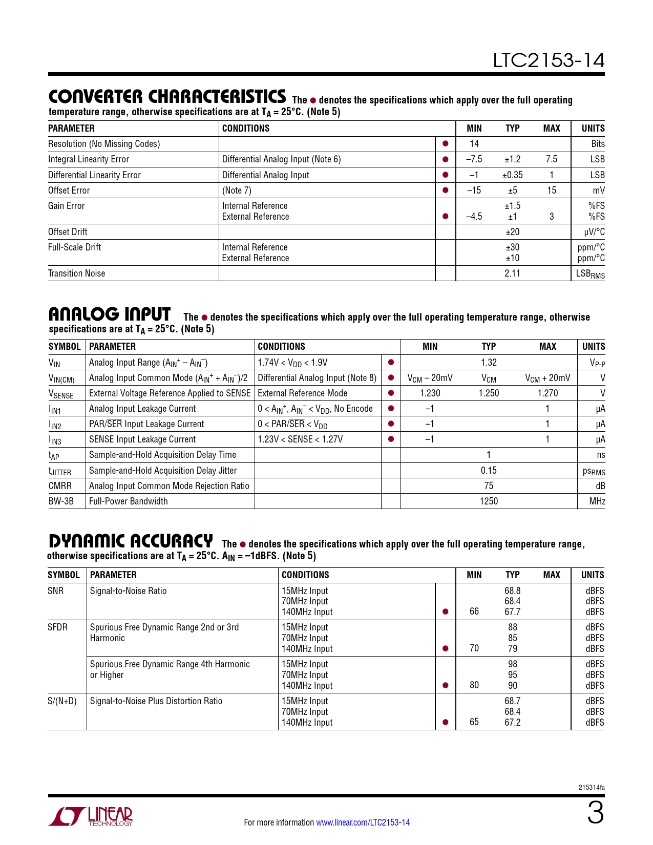 LTC2153-14 c onverTer characTerisTics The l denotes the specifications which apply over the full operatingtemperature range, otherwise specifications are at TA = 25°C. (Note 5)PARAMETERCONDITIONSMINTYPMAXUNITS Resolution (No Missing Codes) l 14 Bits Integral Linearity Error Differential Analog Input (Note 6) l –7.5 ±1.2 7.5 LSB Differential Linearity Error Differential Analog Input l –1 ±0.35 1 LSB Offset Error (Note 7) l –15 ±5 15 mV Gain Error Internal Reference ±1.5 %FS External Reference l –4.5 ±1 3 %FS Offset Drift ±20 µV/°C Full-Scale Drift Internal Reference ±30 ppm/°C External Reference ±10 ppm/°C Transition Noise 2.11 LSBRMS a nalog inpuT The l denotes the specifications which apply over the full operating temperature range, otherwisespecifications are at TA = 25°C. (Note 5)SYMBOL PARAMETERCONDITIONSMINTYPMAXUNITS V + – IN Analog Input Range (AIN – AIN ) 1.74V < VDD < 1.9V l 1.32 VP-P V + – IN(CM) Analog Input Common Mode (AIN + AIN )/2 Differential Analog Input (Note 8) l VCM – 20mV VCM VCM + 20mV V VSENSE External Voltage Reference Applied to SENSE External Reference Mode l 1.230 1.250 1.270 V I + – IN1 Analog Input Leakage Current 0 < AIN , AIN < VDD, No Encode l –1 1 µA IIN2 PAR/SER Input Leakage Current 0 < PAR/SER < VDD l –1 1 µA IIN3 SENSE Input Leakage Current 1.23V < SENSE < 1.27V l –1 1 µA tAP Sample-and-Hold Acquisition Delay Time 1 ns tJITTER Sample-and-Hold Acquisition Delay Jitter 0.15 psRMS CMRR Analog Input Common Mode Rejection Ratio 75 dB BW-3B Full-Power Bandwidth 1250 MHz DynaMic accuracy The l denotes the specifications which apply over the full operating temperature range,otherwise specifications are at TA = 25°C. AIN = –1dBFS. (Note 5)SYMBOL PARAMETERCONDITIONSMINTYPMAXUNITS SNR Signal-to-Noise Ratio 15MHz Input 68.8 dBFS 70MHz Input 68.4 dBFS 140MHz Input l 66 67.7 dBFS SFDR Spurious Free Dynamic Range 2nd or 3rd 15MHz Input 88 dBFS Harmonic 70MHz Input 85 dBFS 140MHz Input l 70 79 dBFS Spurious Free Dynamic Range 4th Harmonic 15MHz Input 98 dBFS or Higher 70MHz Input 95 dBFS 140MHz Input l 80 90 dBFS S/(N+D) Signal-to-Noise Plus Distortion Ratio 15MHz Input 68.7 dBFS 70MHz Input 68.4 dBFS 140MHz Input l 65 67.2 dBFS 215314fa For more information www.linear.com/LTC2153-14 3 Document Outline Features Description Applications Typical Application Absolute Maximum Ratings Pin Configuration Order Information Converter Characteristics Analog Input Dynamic Accuracy Internal Reference Characteristics Power Requirements Digital Inputs And Outputs Timing Characteristics Typical Performance Characteristics Pin Functions Functional Block Diagram Timing Diagrams Applications Information Package Description Related Parts