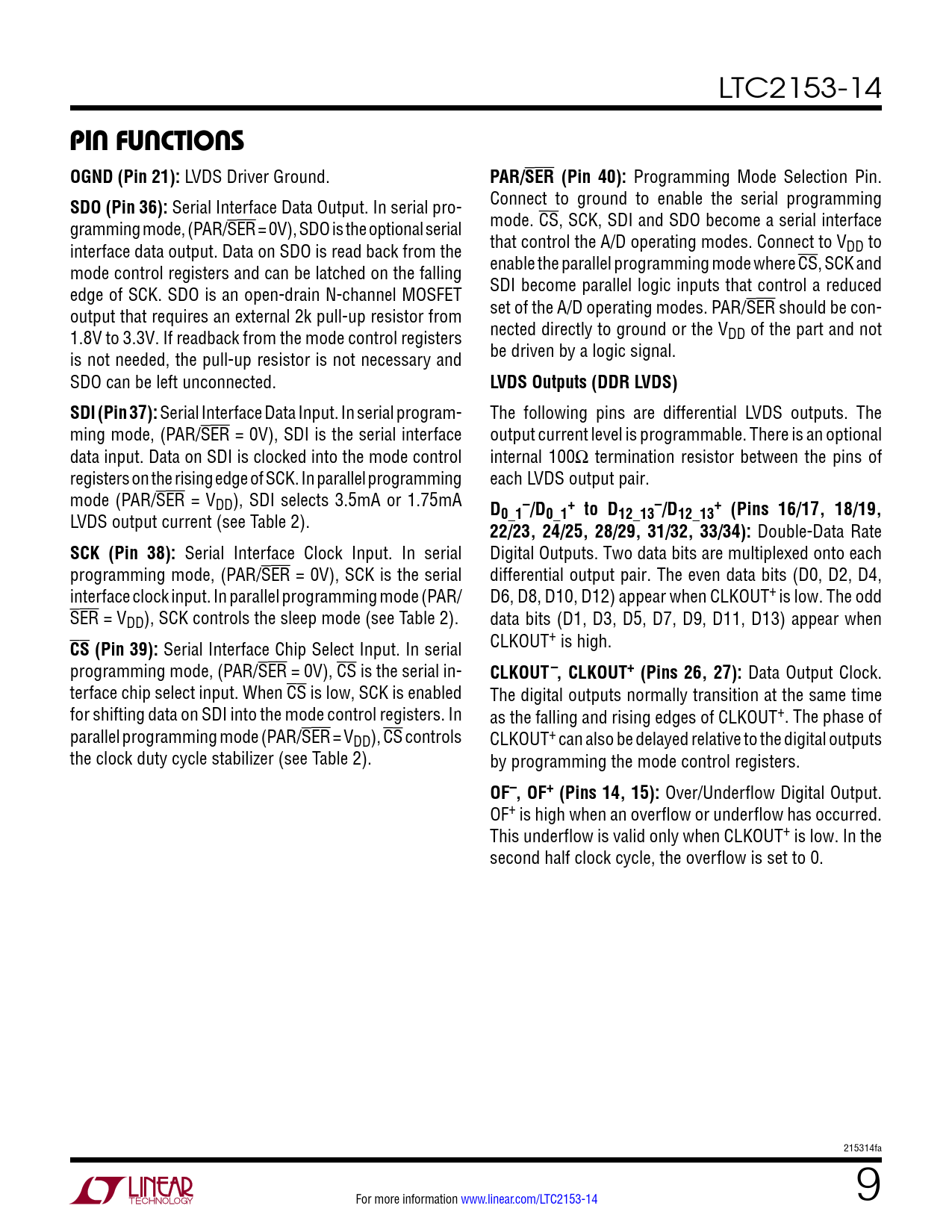 LTC2153-14 pin FuncTionsOGND (Pin 21): LVDS Driver Ground. PAR/SER (Pin 40): Programming Mode Selection Pin. SDO (Pin 36): Serial Interface Data Output. In serial pro- Connect to ground to enable the serial programming gramming mode, (PAR/SER = 0V), SDO is the optional serial mode. CS, SCK, SDI and SDO become a serial interface interface data output. Data on SDO is read back from the that control the A/D operating modes. Connect to VDD to mode control registers and can be latched on the falling enable the parallel programming mode where CS, SCK and edge of SCK. SDO is an open-drain N-channel MOSFET SDI become parallel logic inputs that control a reduced output that requires an external 2k pull-up resistor from set of the A/D operating modes. PAR/SER should be con- 1.8V to 3.3V. If readback from the mode control registers nected directly to ground or the VDD of the part and not is not needed, the pull-up resistor is not necessary and be driven by a logic signal. SDO can be left unconnected. LVDS Outputs (DDR LVDS)SDI (Pin 37): Serial Interface Data Input. In serial program- The following pins are differential LVDS outputs. The ming mode, (PAR/SER = 0V), SDI is the serial interface output current level is programmable. There is an optional data input. Data on SDI is clocked into the mode control internal 100Ω termination resistor between the pins of registers on the rising edge of SCK. In parallel programming each LVDS output pair. mode (PAR/SER = VDD), SDI selects 3.5mA or 1.75mA D –/D + to D–/D+ (Pins 16/17, 18/19, LVDS output current (see Table 2). 0_10_112_1312_1322/23, 24/25, 28/29, 31/32, 33/34): Double-Data Rate SCK (Pin 38): Serial Interface Clock Input. In serial Digital Outputs. Two data bits are multiplexed onto each programming mode, (PAR/SER = 0V), SCK is the serial differential output pair. The even data bits (D0, D2, D4, interface clock input. In parallel programming mode (PAR/ D6, D8, D10, D12) appear when CLKOUT+ is low. The odd SER = VDD), SCK controls the sleep mode (see Table 2). data bits (D1, D3, D5, D7, D9, D11, D13) appear when CS (Pin 39): Serial Interface Chip Select Input. In serial CLKOUT+ is high. programming mode, (PAR/SER = 0V), CS is the serial in- CLKOUT–, CLKOUT+ (Pins 26, 27): Data Output Clock. terface chip select input. When CS is low, SCK is enabled The digital outputs normally transition at the same time for shifting data on SDI into the mode control registers. In as the falling and rising edges of CLKOUT+. The phase of parallel programming mode (PAR/SER = VDD), CS controls CLKOUT+ can also be delayed relative to the digital outputs the clock duty cycle stabilizer (see Table 2). by programming the mode control registers. OF–, OF+ (Pins 14, 15): Over/Underflow Digital Output. OF+ is high when an overflow or underflow has occurred. This underflow is valid only when CLKOUT+ is low. In the second half clock cycle, the overflow is set to 0. 215314fa For more information www.linear.com/LTC2153-14 9 Document Outline Features Description Applications Typical Application Absolute Maximum Ratings Pin Configuration Order Information Converter Characteristics Analog Input Dynamic Accuracy Internal Reference Characteristics Power Requirements Digital Inputs And Outputs Timing Characteristics Typical Performance Characteristics Pin Functions Functional Block Diagram Timing Diagrams Applications Information Package Description Related Parts