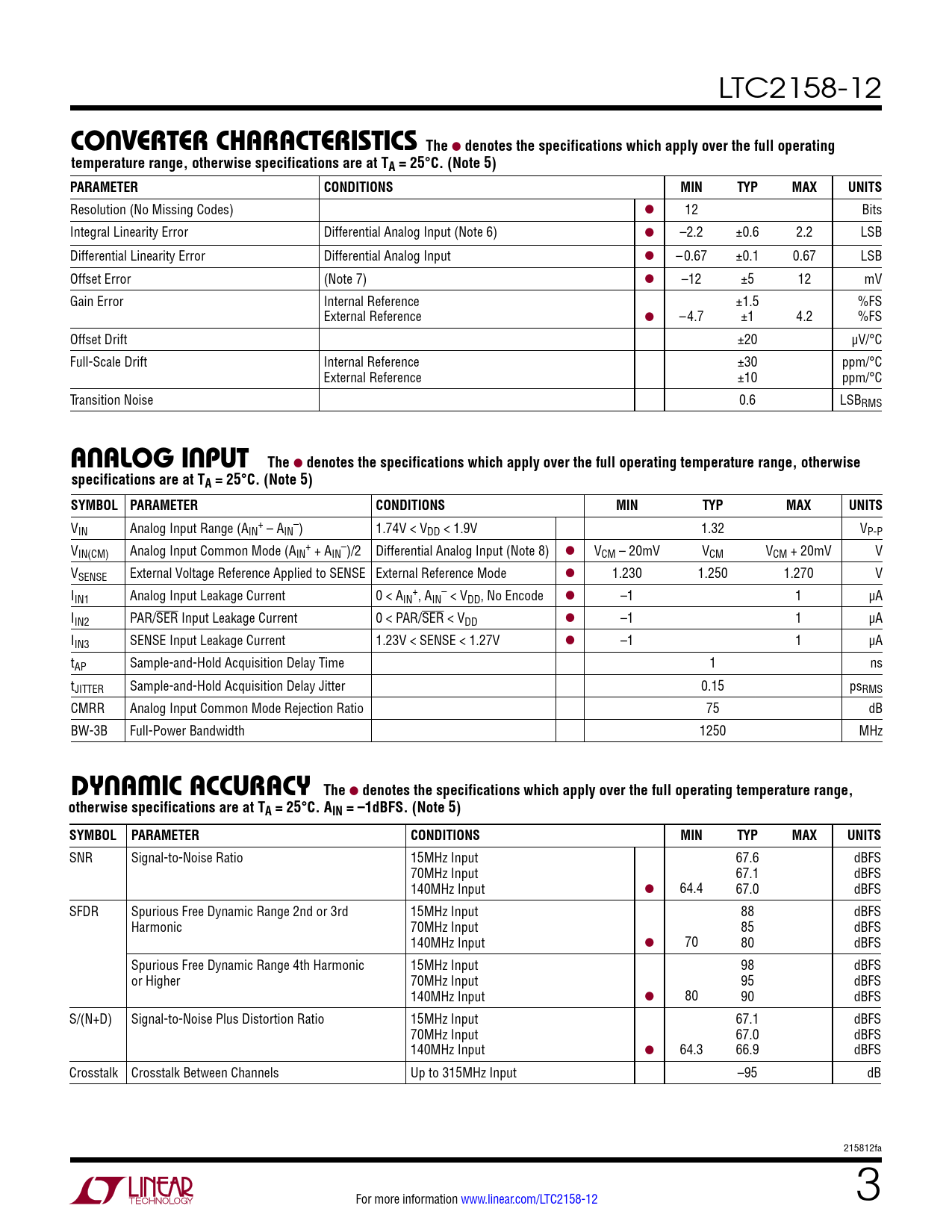 LTC2158-12 CONVERTERCHARACTERISTICS The l denotes the specifications which apply over the full operatingtemperature range, otherwise specifications are at TA = 25°C. (Note 5)PARAMETERCONDITIONSMINTYPMAXUNITS Resolution (No Missing Codes) l 12 Bits Integral Linearity Error Differential Analog Input (Note 6) l –2.2 ±0.6 2.2 LSB Differential Linearity Error Differential Analog Input l –0.67 ±0.1 0.67 LSB Offset Error (Note 7) l –12 ±5 12 mV Gain Error Internal Reference ±1.5 %FS External Reference l –4.7 ±1 4.2 %FS Offset Drift ±20 µV/°C Full-Scale Drift Internal Reference ±30 ppm/°C External Reference ±10 ppm/°C Transition Noise 0.6 LSBRMS ANALOGINPUT The l denotes the specifications which apply over the full operating temperature range, otherwisespecifications are at TA = 25°C. (Note 5)SYMBOL PARAMETERCONDITIONSMINTYPMAXUNITS V + – IN Analog Input Range (AIN – AIN ) 1.74V < VDD < 1.9V 1.32 VP-P V + – IN(CM) Analog Input Common Mode (AIN + AIN )/2 Differential Analog Input (Note 8) l VCM – 20mV VCM VCM + 20mV V VSENSE External Voltage Reference Applied to SENSE External Reference Mode l 1.230 1.250 1.270 V I + – IN1 Analog Input Leakage Current 0 < AIN , AIN < VDD, No Encode l –1 1 µA IIN2 PAR/SER Input Leakage Current 0 < PAR/SER < VDD l –1 1 µA IIN3 SENSE Input Leakage Current 1.23V < SENSE < 1.27V l –1 1 µA tAP Sample-and-Hold Acquisition Delay Time 1 ns tJITTER Sample-and-Hold Acquisition Delay Jitter 0.15 psRMS CMRR Analog Input Common Mode Rejection Ratio 75 dB BW-3B Full-Power Bandwidth 1250 MHz DYNAMICACCURACY The l denotes the specifications which apply over the full operating temperature range,otherwise specifications are at TA = 25°C. AIN = –1dBFS. (Note 5)SYMBOL PARAMETERCONDITIONSMINTYPMAXUNITS SNR Signal-to-Noise Ratio 15MHz Input 67.6 dBFS 70MHz Input 67.1 dBFS 140MHz Input l 64.4 67.0 dBFS SFDR Spurious Free Dynamic Range 2nd or 3rd 15MHz Input 88 dBFS Harmonic 70MHz Input 85 dBFS 140MHz Input l 70 80 dBFS Spurious Free Dynamic Range 4th Harmonic 15MHz Input 98 dBFS or Higher 70MHz Input 95 dBFS 140MHz Input l 80 90 dBFS S/(N+D) Signal-to-Noise Plus Distortion Ratio 15MHz Input 67.1 dBFS 70MHz Input 67.0 dBFS 140MHz Input l 64.3 66.9 dBFS Crosstalk Crosstalk Between Channels Up to 315MHz Input –95 dB 215812fa For more information www.linear.com/LTC2158-12 3 Document Outline Features Description Applications Typical Application Absolute Maximum Ratings Pin Configuration Order Information Converter Characteristics Analog Input Dynamic Accuracy Internal Reference Characteristics Power Requirements Digital Inputs And Outputs Timing Characteristics Typical Performance Characteristics Pin Functions Functional Block Diagram Timing Diagrams Applications Information Typical Applications Package Description Related Parts