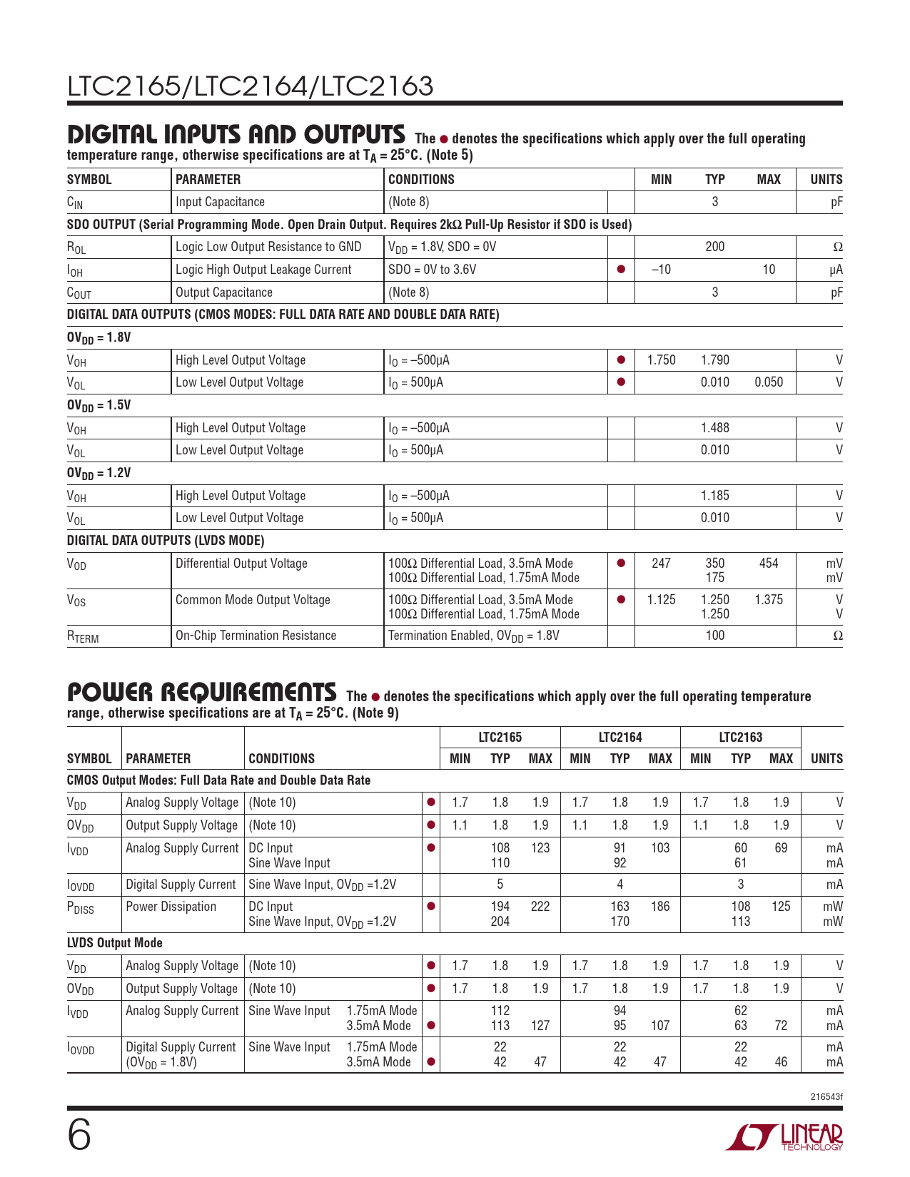 denotes the specifications which apply over the full operating temperature range, otherwise specifications are at TA = 25°C. (Note 9) LTC2165 LTC2164 LTC2163 SYMBOL PARAMETER CONDITIONS MIN TYP MAX MIN TYP MAX MIN TYP MAX UNITS CMOS Output Modes: Full Data Rate and Double Data Rate