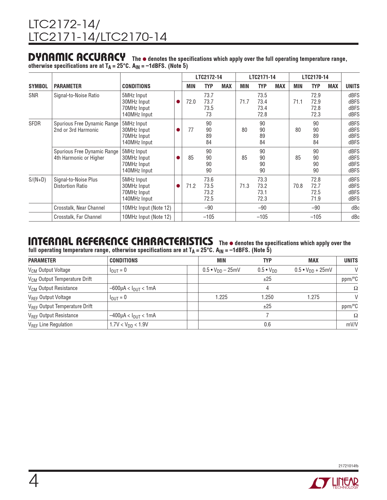 denotes the specifications which apply over the full operating temperature range, otherwise specifications are at TA = 25°C. AIN = –1dBFS. (Note 5) LTC2172-14 LTC2171-14 LTC2170-14 SYMBOL PARAMETER CONDITIONS MIN TYP MAX MIN TYP MAX MIN TYP MAX UNITS