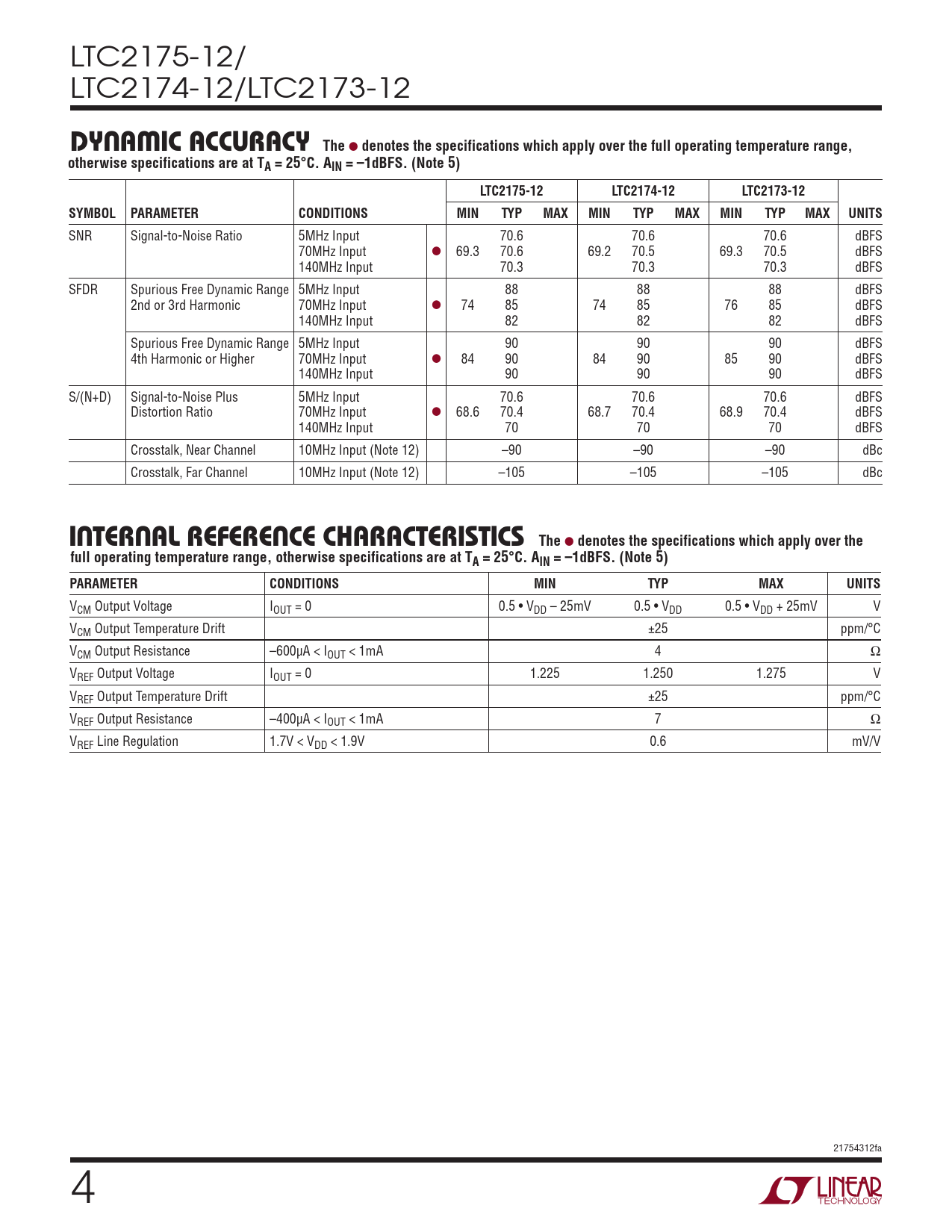 denotes the specifications which apply over the full operating temperature range, otherwise specifications are at TA = 25°C. AIN = –1dBFS. (Note 5) LTC2175-12 LTC2174-12 LTC2173-12 SYMBOL PARAMETER CONDITIONS MIN TYP MAX MIN TYP MAX MIN TYP MAX UNITS