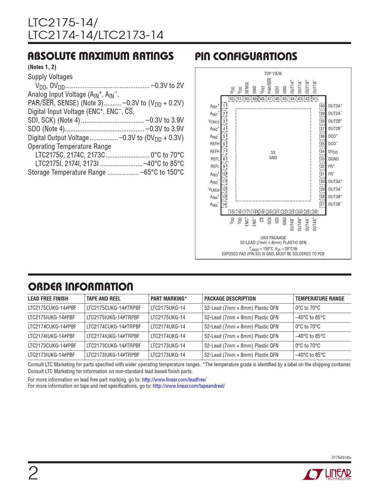 LTC2175-14/ LTC2174-14/LTC2173-14 absoluTe MaxiMuM raTingspin conFiguraTions(Notes 1, 2) Supply Voltages TOP VIEW + – + – V SER DD, OVDD .. –0.3V to 2V Analog Input Voltage (A + – V DD V DD SENSE GND V REF PAR/ SDO GND OUT1A OUT1A OUT1B OUT1B IN , AIN , PAR/SER, SENSE) (Note 3) .. –0.3V to (V 52 51 50 49 48 47 46 45 44 43 42 41 DD + 0.2V) A + IN1 1 40 OUT2A+ Digital Input Voltage (ENC+, ENC–, CS, A – IN1 2 39 OUT2A– SDI, SCK) (Note 4) .. –0.3V to 3.9V VCM12 3 38 OUT2B+ SDO (Note 4) ... –0.3V to 3.9V A + IN2 4 37 OUT2B– Digital Output Voltage .. –0.3V to (OV – DD + 0.3V) AIN2 5 36 DCO+ Operating Temperature Range REFH 6 35 DCO– LTC2175C, 2174C, 2173C ... 0°C to 70°C REFH 7 53 34 OVDD GND LTC2175I, 2174I, 2173I ..–40°C to 85°C REFL 8 33 OGND REFL 9 32 FR+ Storage Temperature Range .. –65°C to 150°C A + IN3 10 31 FR– A – IN3 11 30 OUT3A+ VCM34 12 29 OUT3A– A + IN4 13 28 OUT3B+ A – IN4 14 27 OUT3B– 15 16 17 18 19 20 21 22 23 24 25 26 + – – + – + V DD V DD CS ENC ENC SCK SDI GND OUT4B OUT4B OUT4A OUT4A UKG PACKAGE 52-LEAD (7mm × 8mm) PLASTIC QFN TJMAX = 150°C, θJA = 28°C/W EXPOSED PAD (PIN 53) IS GND, MUST BE SOLDERED TO PCB orDer inForMaTion LEAD FREE FINISHTAPE AND REELPART MARKING*PACKAGE DESCRIPTIONTEMPERATURE RANGE LTC2175CUKG-14#PBF LTC2175CUKG-14#TRPBF LTC2175UKG-14 52-Lead (7mm × 8mm) Plastic QFN 0°C to 70°C LTC2175IUKG-14#PBF LTC2175IUKG-14#TRPBF LTC2175UKG-14 52-Lead (7mm × 8mm) Plastic QFN –40°C to 85°C LTC2174CUKG-14#PBF LTC2174CUKG-14#TRPBF LTC2174UKG-14 52-Lead (7mm × 8mm) Plastic QFN 0°C to 70°C LTC2174IUKG-14#PBF LTC2174IUKG-14#TRPBF LTC2174UKG-14 52-Lead (7mm × 8mm) Plastic QFN –40°C to 85°C LTC2173CUKG-14#PBF LTC2173CUKG-14#TRPBF LTC2173UKG-14 52-Lead (7mm × 8mm) Plastic QFN 0°C to 70°C LTC2173IUKG-14#PBF LTC2173IUKG-14#TRPBF LTC2173UKG-14 52-Lead (7mm × 8mm) Plastic QFN –40°C to 85°C Consult LTC Marketing for parts specified with wider operating temperature ranges. *The temperature grade is identified by a label on the shipping container. Consult LTC Marketing for information on non-standard lead based finish parts. For more information on lead free part marking, go to: http://www.linear.com/leadfree/ For more information on tape and reel specifications, go to: http://www.linear.com/tapeandreel/ 21754314fa 2 Document Outline Features Applications Description Typical Application Absolute Maximum Ratings Pin Configuration Order Information Converter Characteristics Analog Input Dynamic Accuracy Internal Reference Characteristics Digital Inputs and Outputs Power Requirements Timing Characteristics Timing Diagrams Typical Performance Characteristics Pin Functions Functional Block Diagram Applications Information Typical Applications Package Description Revision History Related Parts