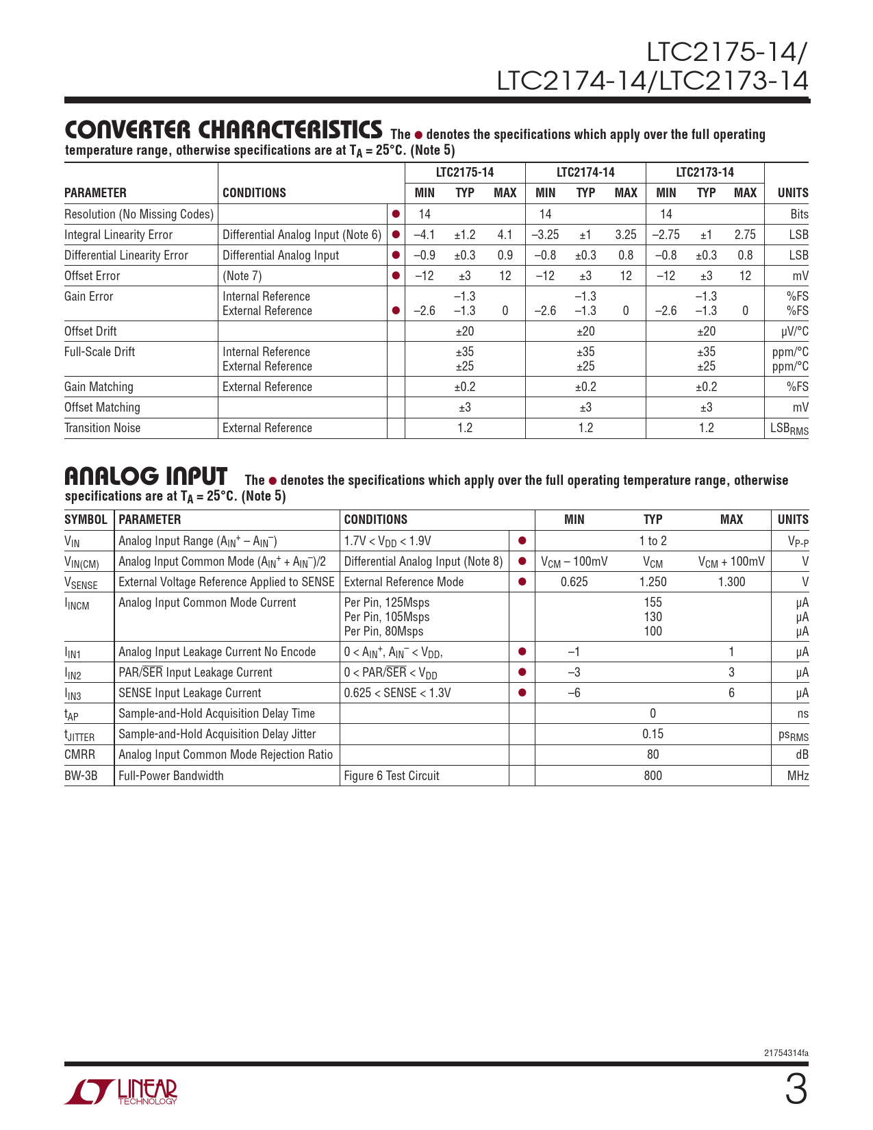 LTC2175-14/ LTC2174-14/LTC2173-14 converTer characTerisTicsThe l denotes the specifications which apply over the full operatingtemperature range, otherwise specifications are at TA = 25°C. (Note 5)LTC2175-14LTC2174-14LTC2173-14PARAMETERCONDITIONSMINTYPMAXMINTYPMAXMINTYPMAXUNITS Resolution (No Missing Codes) l 14 14 14 Bits Integral Linearity Error Differential Analog Input (Note 6) l –4.1 ±1.2 4.1 –3.25 ±1 3.25 –2.75 ±1 2.75 LSB Differential Linearity Error Differential Analog Input l –0.9 ±0.3 0.9 –0.8 ±0.3 0.8 –0.8 ±0.3 0.8 LSB Offset Error (Note 7) l –12 ±3 12 –12 ±3 12 –12 ±3 12 mV Gain Error Internal Reference –1.3 –1.3 –1.3 %FS External Reference l –2.6 –1.3 0 –2.6 –1.3 0 –2.6 –1.3 0 %FS Offset Drift ±20 ±20 ±20 µV/°C Full-Scale Drift Internal Reference ±35 ±35 ±35 ppm/°C External Reference ±25 ±25 ±25 ppm/°C Gain Matching External Reference ±0.2 ±0.2 ±0.2 %FS Offset Matching ±3 ±3 ±3 mV Transition Noise External Reference 1.2 1.2 1.2 LSBRMS analog inpuTThe l denotes the specifications which apply over the full operating temperature range, otherwisespecifications are at TA = 25°C. (Note 5)SYMBOL PARAMETERCONDITIONSMINTYPMAXUNITS V + – IN Analog Input Range (AIN – AIN ) 1.7V < VDD < 1.9V l 1 to 2 VP-P V + – IN(CM) Analog Input Common Mode (AIN + AIN )/2 Differential Analog Input (Note 8) l VCM – 100mV VCM VCM + 100mV V VSENSE External Voltage Reference Applied to SENSE External Reference Mode l 0.625 1.250 1.300 V IINCM Analog Input Common Mode Current Per Pin, 125Msps 155 µA Per Pin, 105Msps 130 µA Per Pin, 80Msps 100 µA I + – IN1 Analog Input Leakage Current No Encode 0 < AIN , AIN < VDD, l –1 1 µA IIN2 PAR/SER Input Leakage Current 0 < PAR/SER < VDD l –3 3 µA IIN3 SENSE Input Leakage Current 0.625 < SENSE < 1.3V l –6 6 µA tAP Sample-and-Hold Acquisition Delay Time 0 ns tJITTER Sample-and-Hold Acquisition Delay Jitter 0.15 psRMS CMRR Analog Input Common Mode Rejection Ratio 80 dB BW-3B Full-Power Bandwidth Figure 6 Test Circuit 800 MHz 21754314fa 3 Document Outline Features Applications Description Typical Application Absolute Maximum Ratings Pin Configuration Order Information Converter Characteristics Analog Input Dynamic Accuracy Internal Reference Characteristics Digital Inputs and Outputs Power Requirements Timing Characteristics Timing Diagrams Typical Performance Characteristics Pin Functions Functional Block Diagram Applications Information Typical Applications Package Description Revision History Related Parts