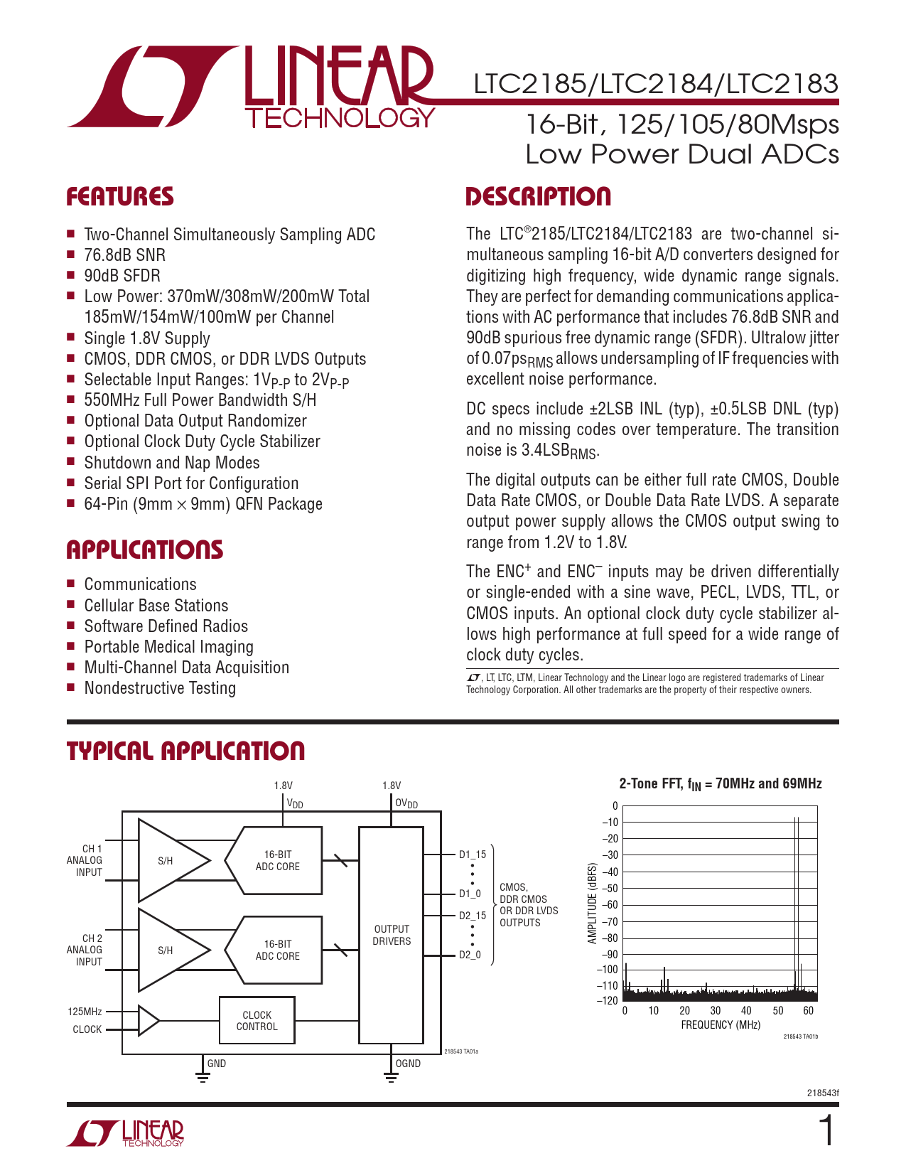 LTC2185/LTC2184/LTC2183 16-Bit, 125/105/80Msps Low Power Dual ADCs
