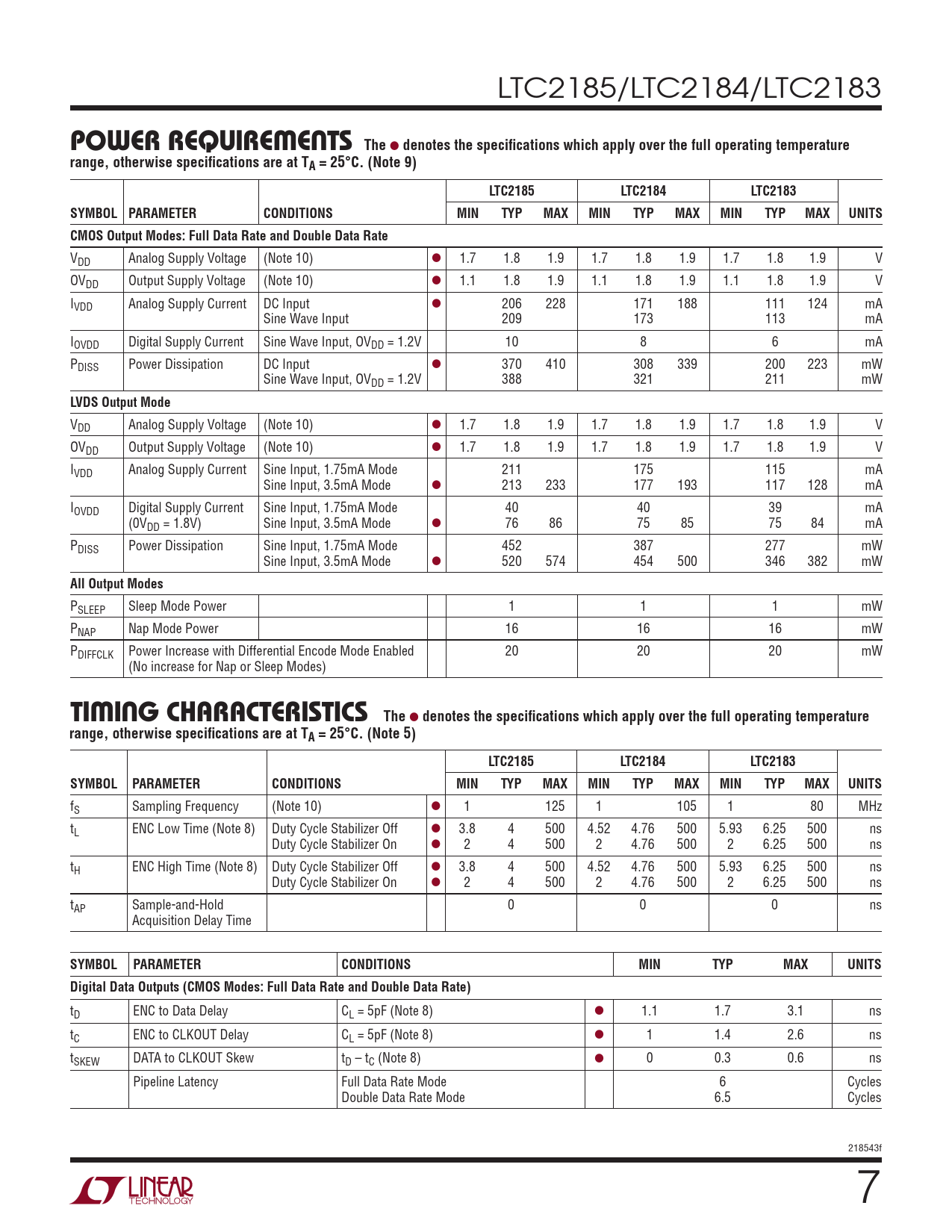 denotes the specifications which apply over the full operating temperature range, otherwise specifications are at TA = 25°C. (Note 9) LTC2185 LTC2184 LTC2183 SYMBOL PARAMETER CONDITIONS MIN TYP MAX MIN TYP MAX MIN TYP MAX UNITS CMOS Output Modes: Full Data Rate and Double Data Rate