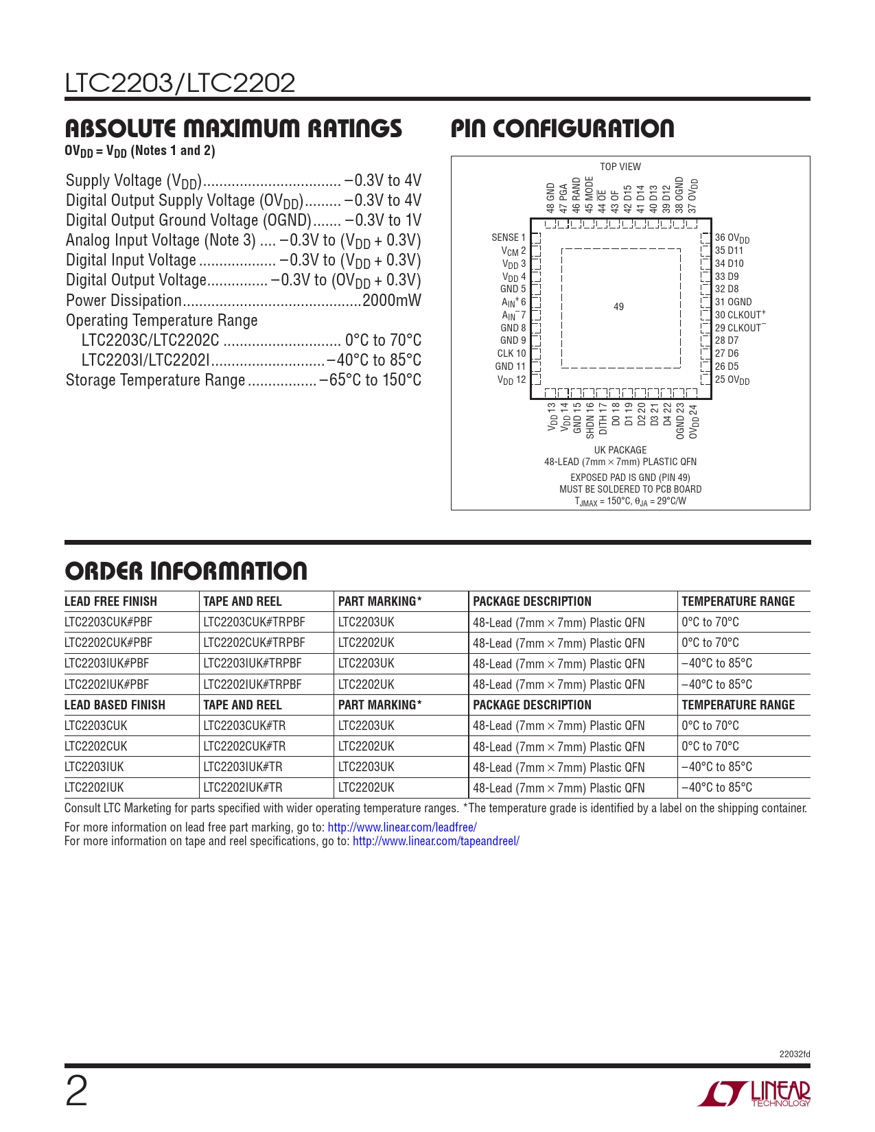 LTC2203CUK LTC2203CUK#TR LTC2203UK 48-Lead (7mm × 7mm) Plastic QFN 0°C to 70°C LTC2202CUK LTC2202CUK#TR LTC2202UK 48-Lead (7mm × 7mm) Plastic QFN 0°C to 70°C LTC2203IUK LTC2203IUK#TR LTC2203UK 48-Lead (7mm × 7mm) Plastic QFN –40°C to 85°C LTC2202IUK LTC2202IUK#TR LTC2202UK 48-Lead (7mm × 7mm) Plastic QFN –40°C to 85°C Consult LTC Marketing for parts specifi ed with wider operating temperature ranges. *The temperature grade is identifi ed by a label on the shipping container. For more information on lead free part marking, go to: http://www.linear.com/leadfree/ For more information on tape and reel specifi cations, go to: http://www.linear.com/tapeandreel/ 22032fd 2