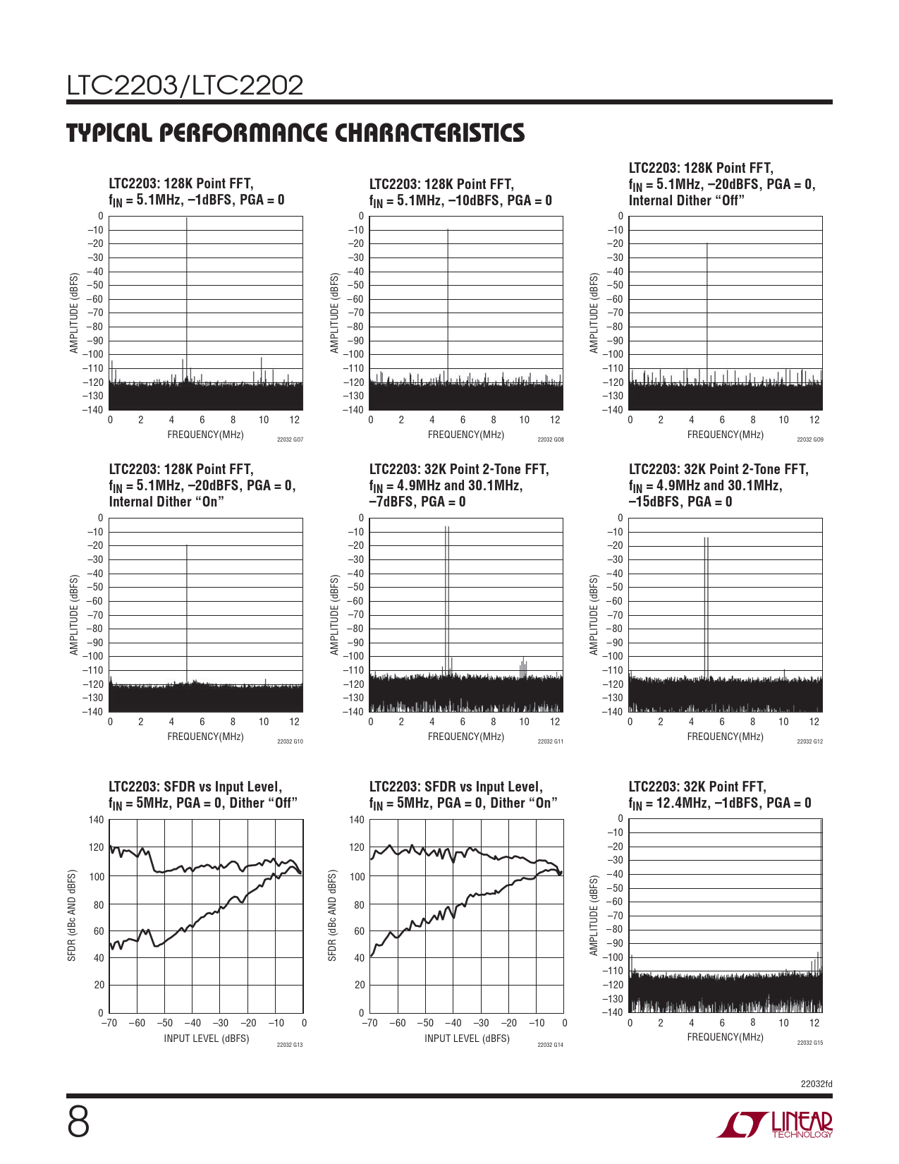 | Pages / Page | 32 / 8 — TYPICAL PERFORMANCE CHARACTERISTICS. LTC2203: 128K Point FFT,. fIN = … |