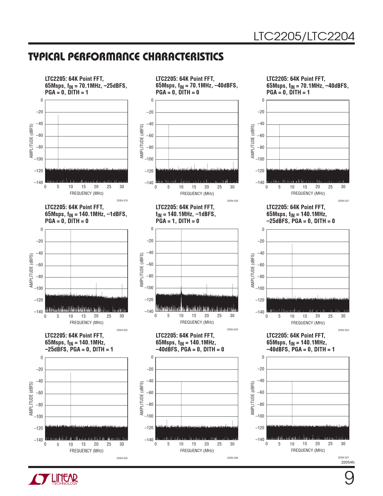 | Pages / Page | 36 / 9 — TYPICAL PERFORMANCE CHARACTERISTICS. LTC2205: 64K Point FFT,. 65Msps, fIN … |