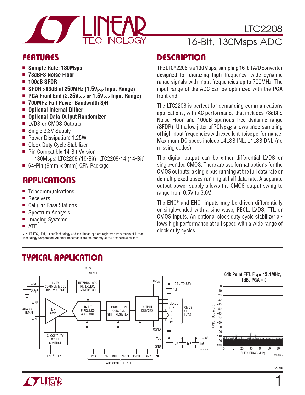 LTC2208 16-Bit, 130Msps ADC FEATURESDESCRIPTION n Sample Rate: 130Msps The LTC®2208 is a 130Msps, sampling 16-bit A/D converter n 78dBFS Noise Floor designed for digitizing high frequency, wide dynamic n 100dB SFDR range signals with input frequencies up to 700MHz. The n SFDR >83dB at 250MHz (1.5VP-P Input Range) input range of the ADC can be optimized with the PGA n PGA Front End (2.25VP-P or 1.5VP-P Input Range) front end. n 700MHz Full Power Bandwidth S/H The LTC2208 is perfect for demanding communications n Optional Internal Dither applications, with AC performance that includes 78dBFS n Optional Data Output Randomizer Noise Floor and 100dB spurious free dynamic range n LVDS or CMOS Outputs (SFDR). Ultra low jitter of 70fsRMS allows undersampling n Single 3.3V Supply of high input frequencies with excellent noise performance. n Power Dissipation: 1.25W Maximum DC specs include ±4LSB INL, ±1LSB DNL (no n Clock Duty Cycle Stabilizer missing codes). n Pin Compatible 14-Bit Version 130Msps: LTC2208 (16-Bit), LTC2208-14 (14-Bit) The digital output can be either differential LVDS or n 64-Pin (9mm single-ended CMOS. There are two format options for the × 9mm) QFN Package CMOS outputs: a single bus running at the full data rate or APPLICATIONS demultiplexed buses running at half data rate. A separate output power supply allows the CMOS output swing to n Telecommunications range from 0.5V to 3.6V. n Receivers The ENC+ and ENC– inputs may be driven differentially n Cellular Base Stations or single-ended with a sine wave, PECL, LVDS, TTL or n Spectrum Analysis CMOS inputs. An optional clock duty cycle stabilizer al- n Imaging Systems lows high performance at full speed with a wide range of n ATE clock duty cycles. L, LT, LTC, LTM, Linear Technology and the Linear logo are registered trademarks of Linear Technology Corporation. All other trademarks are the property of their respective owners. TYPICAL APPLICATION 3.3V SENSE 64k Point FFT, FIN = 15.1MHz, OV –1dB, PGA = 0 1.25V INTERNAL ADC DD VCM 0.5V TO 3.6V COMMON MODE REFERENCE 0 2.2μF BIAS VOLTAGE GENERATOR 1μF –10 –20 OF –30 AIN+ CLKOUT –40 + 16-BIT CORRECTION OUTPUT D15 CMOS ANALOG –50 S/H PIPELINED LOGIC AND DRIVERS • OR INPUT AMP ADC CORE –60 SHIFT REGISTER LVDS – • –70 AIN– • D0 –80 AMPLITUDE (dBFS) –90 OGND –100 CLOCK/DUTY –110 CYCLE V 3.3V DD –120 CONTROL 1μF 1μF 1μF –130 GND 2208 TA01 0 10 20 30 40 50 60 FREQUENCY (MHz) 2208 TA01b ENC + ENC – PGA SHDN DITH MODE LVDS RAND ADC CONTROL INPUTS 2208fc 1