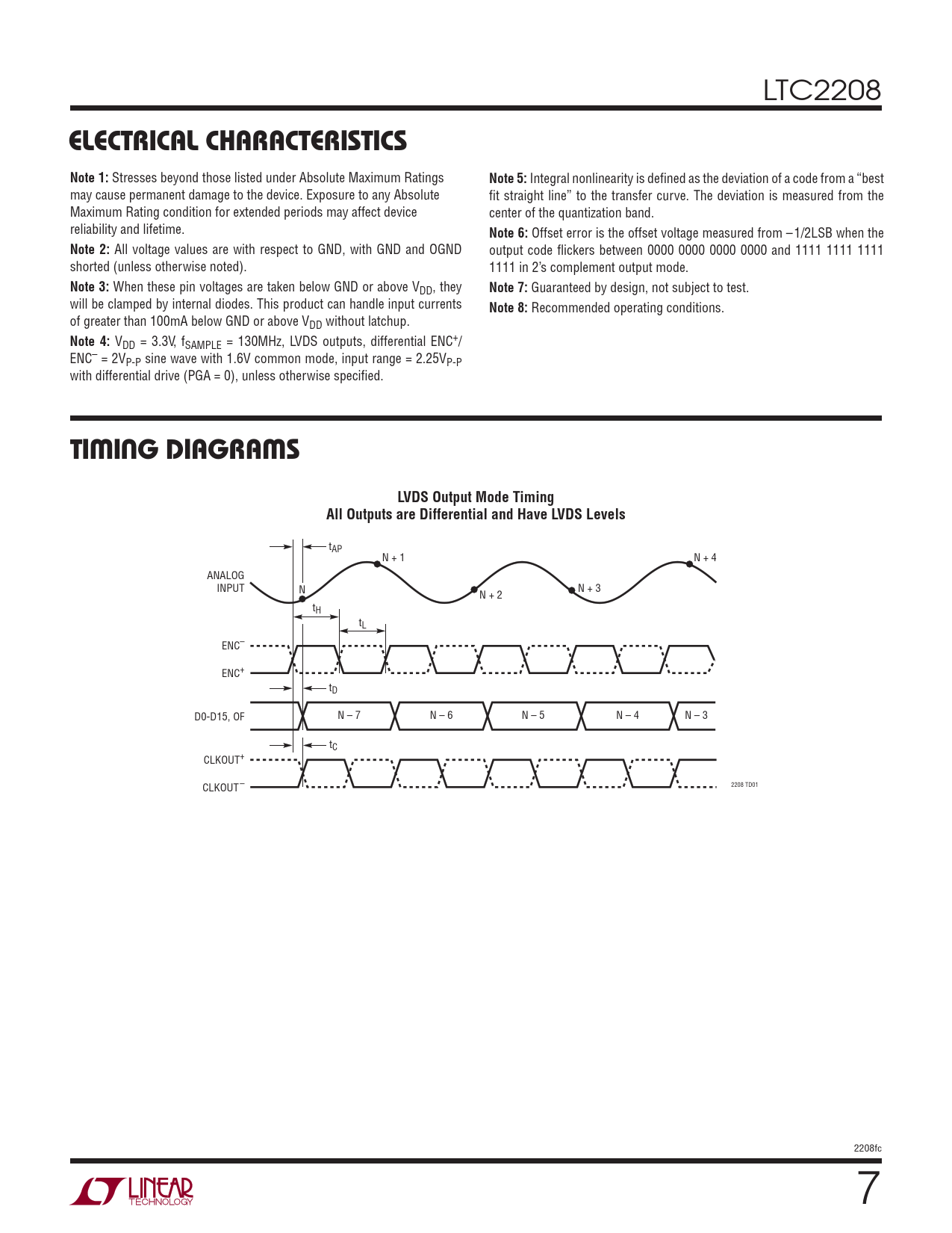 LTC2208 ELECTRICAL CHARACTERISTICSNote 1: Stresses beyond those listed under Absolute Maximum Ratings Note 5: Integral nonlinearity is defi ned as the deviation of a code from a “best may cause permanent damage to the device. Exposure to any Absolute fi t straight line” to the transfer curve. The deviation is measured from the Maximum Rating condition for extended periods may affect device center of the quantization band. reliability and lifetime. Note 6: Offset error is the offset voltage measured from – 1/2LSB when the Note 2: All voltage values are with respect to GND, with GND and OGND output code fl ickers between 0000 0000 0000 0000 and 1111 1111 1111 shorted (unless otherwise noted). 1111 in 2’s complement output mode. Note 3: When these pin voltages are taken below GND or above VDD, they Note 7: Guaranteed by design, not subject to test. will be clamped by internal diodes. This product can handle input currents Note 8: Recommended operating conditions. of greater than 100mA below GND or above VDD without latchup. Note 4: VDD = 3.3V, fSAMPLE = 130MHz, LVDS outputs, differential ENC+/ ENC– = 2VP-P sine wave with 1.6V common mode, input range = 2.25VP-P with differential drive (PGA = 0), unless otherwise specifi ed. TIMING DIAGRAMSLVDS Output Mode TimingAll Outputs are Differential and Have LVDS Levels tAP N + 1 N + 4 ANALOG INPUT N N + 3 N + 2 tH tL ENC– ENC+ tD D0-D15, OF N – 7 N – 6 N – 5 N – 4 N – 3 tC CLKOUT+ CLKOUT – 2208 TD01 2208fc 7