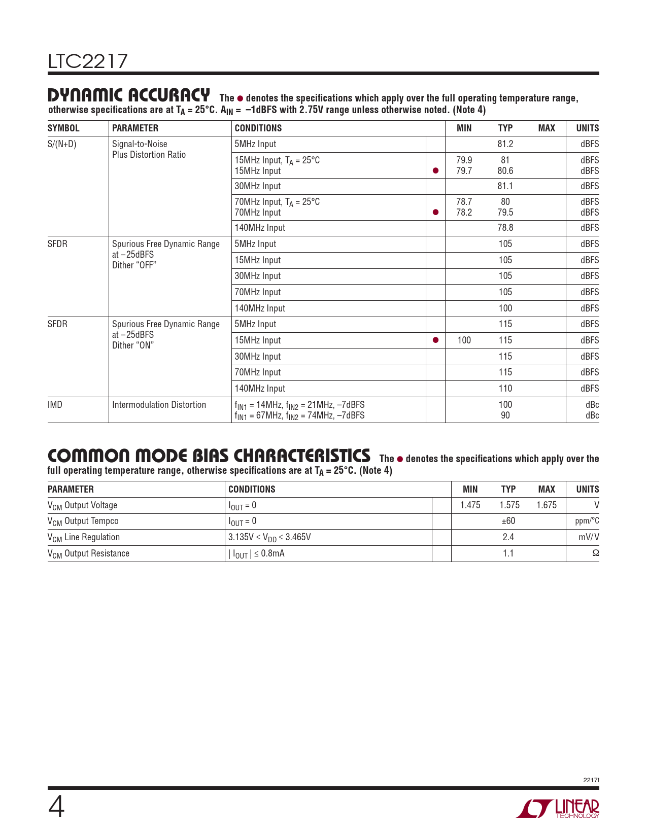 VCM Output Voltage IOUT = 0 1.475 1.575 1.675 V VCM Output Tempco IOUT = 0 ±60 ppm/°C VCM Line Regulation 3.135V ≤ VDD ≤ 3.465V 2.4 mV/ V VCM Output Resistance | IOUT | ≤ 0.8mA 1.1 Ω 2217f 4