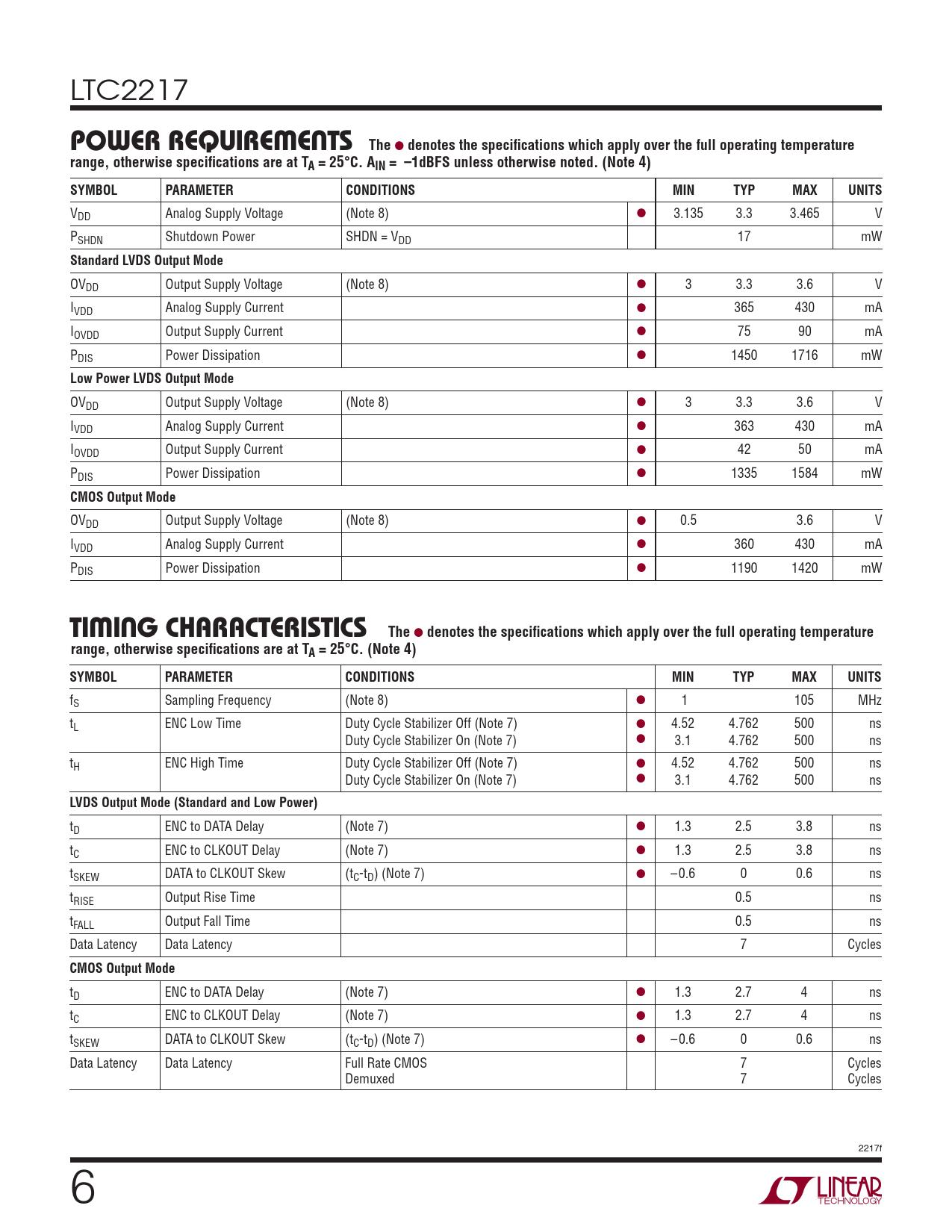 tD ENC to DATA Delay (Note 7) ● 1.3 2.7 4 ns tC ENC to CLKOUT Delay (Note 7) ● 1.3 2.7 4 ns tSKEW DATA to CLKOUT Skew (tC-tD) (Note 7) ● –0.6 0 0.6 ns Data Latency Data Latency Full Rate CMOS 7 Cycles Demuxed 7 Cycles 2217f 6
