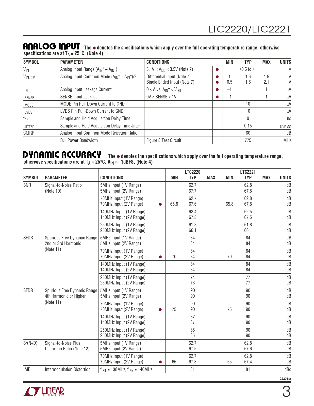 LTC2220/LTC2221 UUA ALOG I PUT The ● denotes the specifications which apply over the full operating temperature range, otherwisespecifications are at TA = 25 ° C. (Note 4)SYMBOLPARAMETERCONDITIONSMINTYPMAXUNITS V + – IN Analog Input Range (AIN – AIN ) 3.1V < VDD < 3.5V (Note 7) ● ±0.5 to ±1 V V + – IN, CM Analog Input Common Mode (AIN + AIN )/2 Differential Input (Note 7) ● 1 1.6 1.9 V Single Ended Input (Note 7) ● 0.5 1.6 2.1 V I + – IN Analog Input Leakage Current 0 < AIN , AIN < VDD ● –1 1 µA ISENSE SENSE Input Leakage 0V < SENSE < 1V ● –1 1 µA IMODE MODE Pin Pull-Down Current to GND 10 µA ILVDS LVDS Pin Pull-Down Current to GND 10 µA tAP Sample and Hold Acquisition Delay Time 0 ns tJITTER Sample and Hold Acquisition Delay Time Jitter 0.15 psRMS CMRR Analog Input Common Mode Rejection Ratio 80 dB Full Power Bandwidth Figure 8 Test Circuit 775 MHz UWDY A IC ACCURACY The ● denotes the specifications which apply over the full operating temperature range,otherwise specifications are at TA = 25 ° C. AIN = –1dBFS. (Note 4)LTC2220LTC2221SYMBOLPARAMETERCONDITIONSMINTYPMAXMINTYPMAXUNITS SNR Signal-to-Noise Ratio 5MHz Input (1V Range) 62.7 62.8 dB (Note 10) 5MHz Input (2V Range) 67.7 67.8 dB 70MHz Input (1V Range) 62.7 62.8 dB 70MHz Input (2V Range) ● 65.8 67.6 65.8 67.8 dB 140MHz Input (1V Range) 62.4 62.5 dB 140MHz Input (2V Range) 67.5 67.5 dB 250MHz Input (1V Range) 61.8 61.8 dB 250MHz Input (2V Range) 66.1 66.1 dB SFDR Spurious Free Dynamic Range 5MHz Input (1V Range) 84 84 dB 2nd or 3rd Harmonic 5MHz Input (2V Range) 84 84 dB (Note 11) 70MHz Input (1V Range) 84 84 dB 70MHz Input (2V Range) ● 70 84 70 84 dB 140MHz Input (1V Range) 84 84 dB 140MHz Input (2V Range) 84 84 dB 250MHz Input (1V Range) 74 77 dB 250MHz Input (2V Range) 73 77 dB SFDR Spurious Free Dynamic Range 5MHz Input (1V Range) 90 90 dB 4th Harmonic or Higher 5MHz Input (2V Range) 90 90 dB (Note 11) 70MHz Input (1V Range) 90 90 dB 70MHz Input (2V Range) ● 75 90 75 90 dB 140MHz Input (1V Range) 87 90 dB 140MHz Input (2V Range) 87 90 dB 250MHz Input (1V Range) 85 90 dB 250MHz Input (2V Range) 85 90 dB S/(N+D) Signal-to-Noise Plus 5MHz Input (1V Range) 62.7 62.8 dB Distortion Ratio (Note 12) 5MHz Input (2V Range) 67.5 67.6 dB 70MHz Input (1V Range) 62.7 62.8 dB 70MHz Input (2V Range) ● 65 67.3 65 67.4 dB IMD Intermodulation Distortion fIN1 = 138MHz, fIN2 = 140MHz 81 81 dBc 22201fa 3